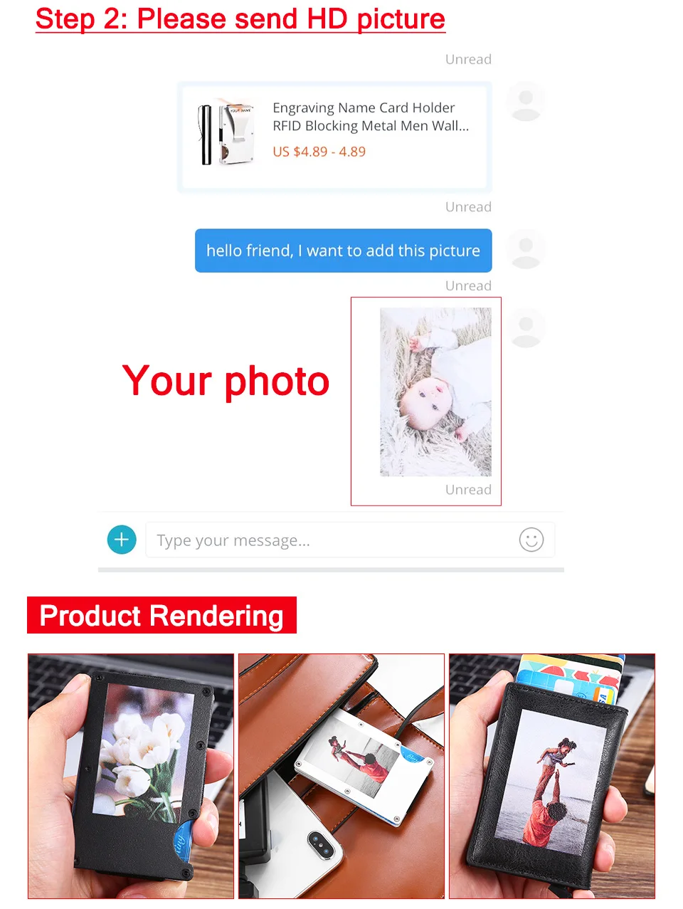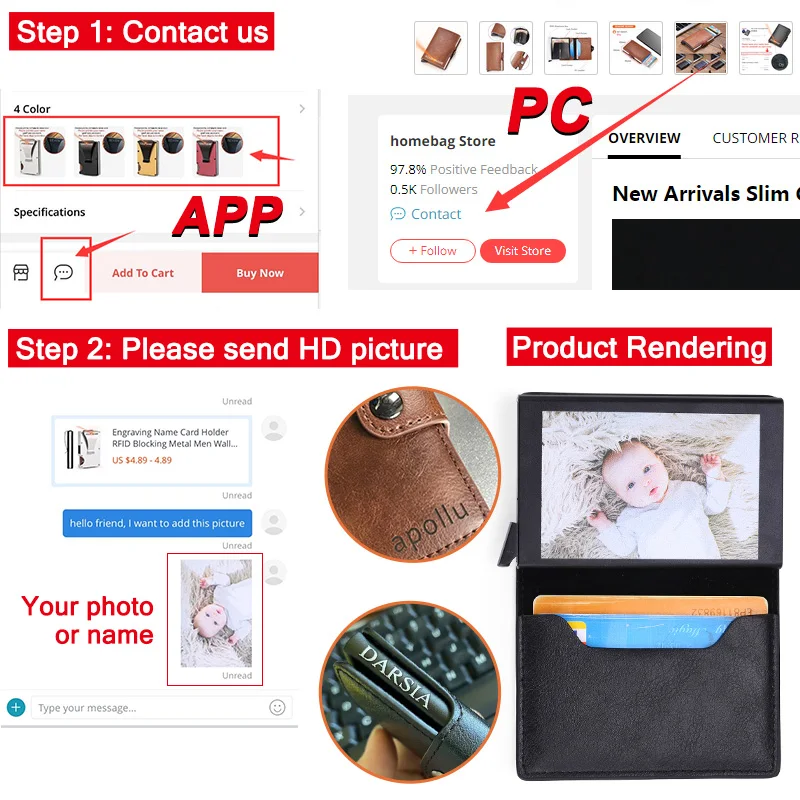 1. Пожалуйста, оставьте свое имя в заказах, если вам нужна гравировка, или мы отправим как обычно без гравировки. 2. У нас есть только два элемента держателя карты, которые поддерживают, чтобы добавить ваши фотографии на коробке. 3. Пожалуйста, свяжитесь с нами и дайте нам картинку. Пиксель изображения должен быть большим, чем 1000*1000. 4. Нет гарантии возврата или обмена на детали гравировки.