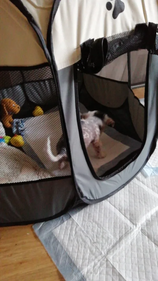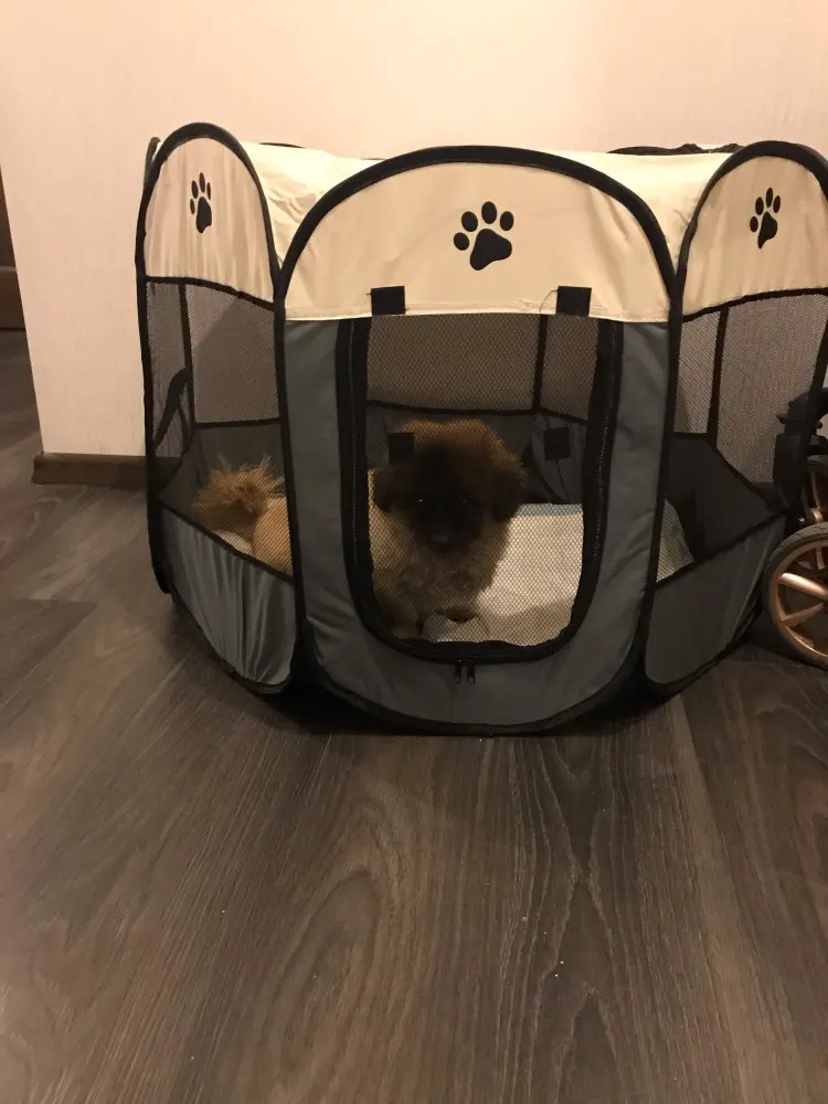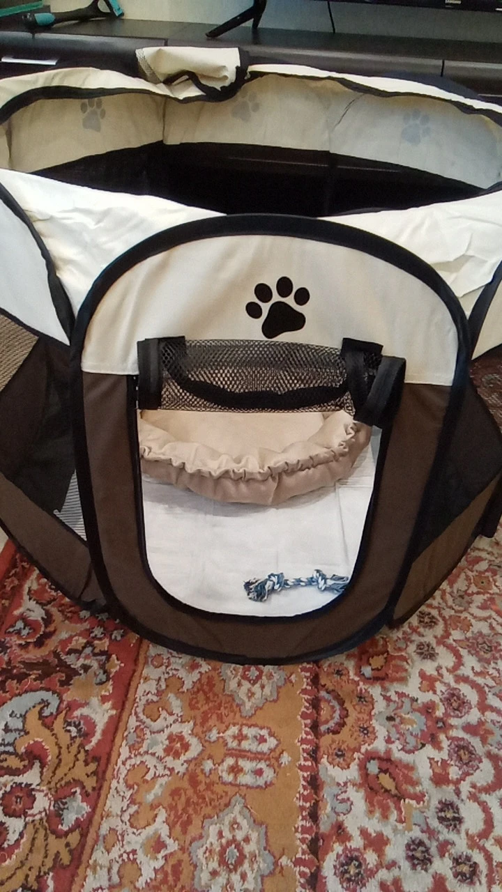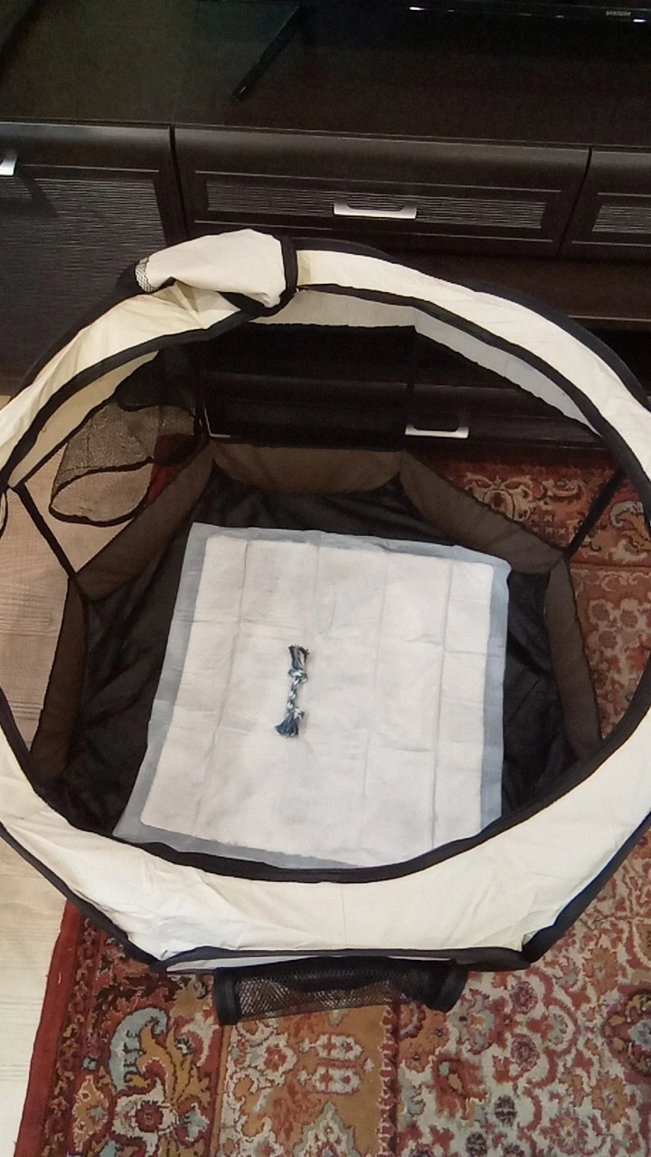 Потрясающее качество! Легко надевать и снимать. Очень компактный при хранении или перемещении. Мы получили 91X91 и его отличную площадь для наших 2,5 фунта Мальтийского