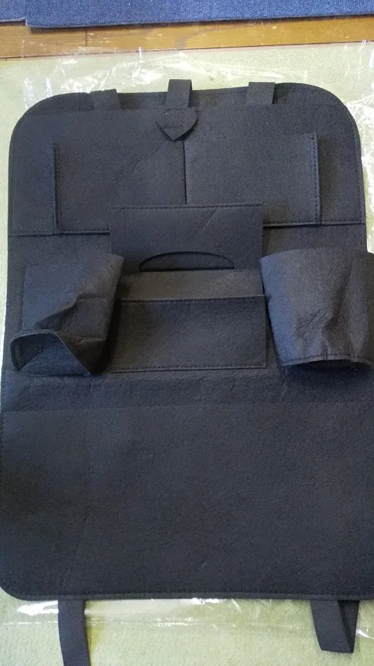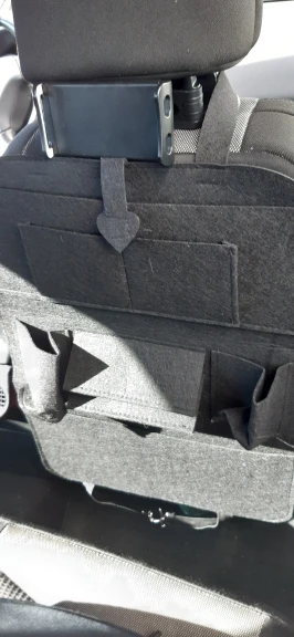 Органайзер из тонкого лёгкого войлока. Приятный на ощупь. Легко крепится. Сверху за стойки подголовника, снизу крючками к днищу сиденья. Брал для дочки 6 лет. Она всегда сидит за мной. Ей очень понравился. Сразу заполнила салфетками, игрушками, стаканчиками и т.п.