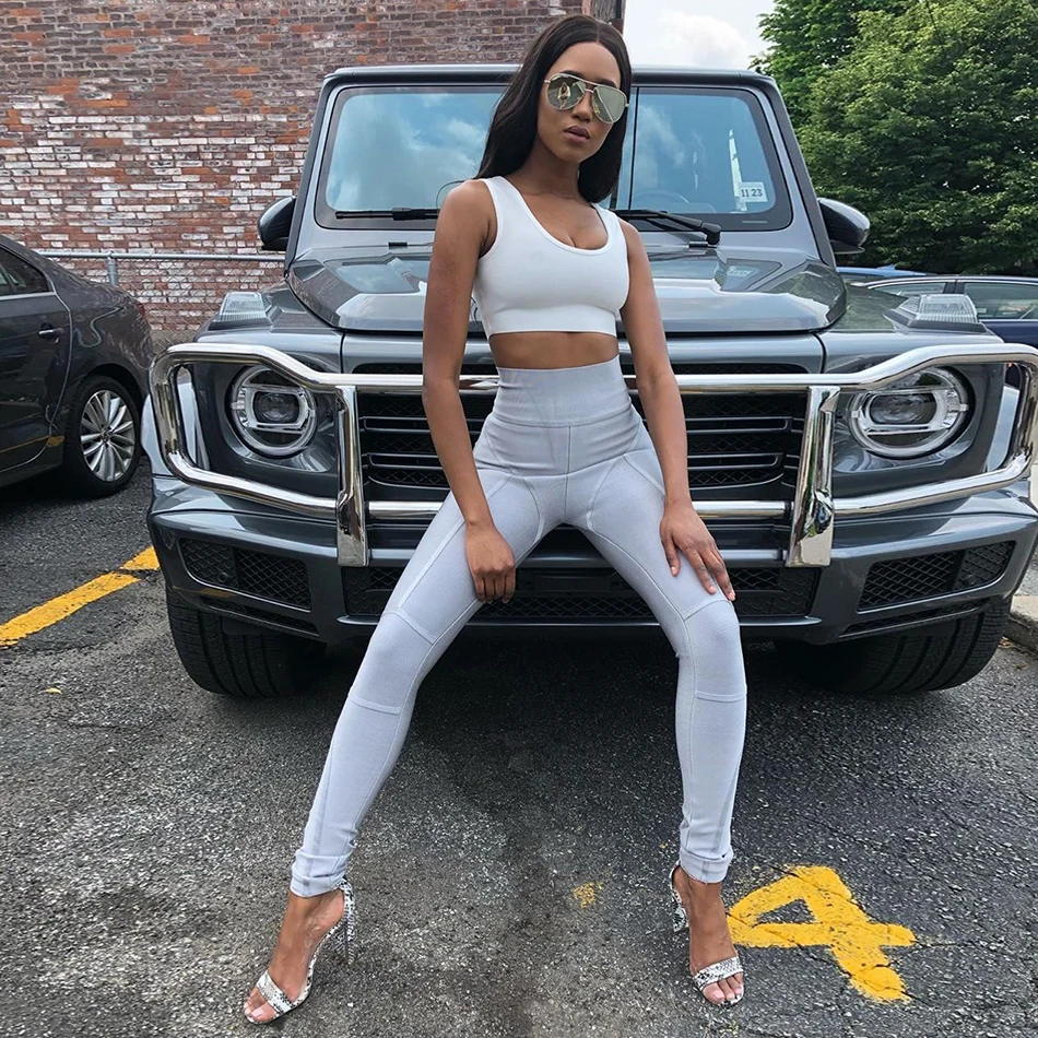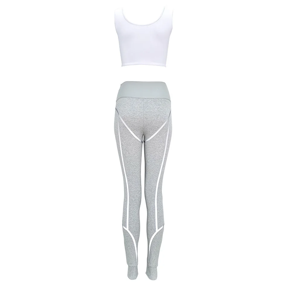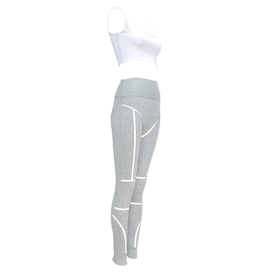 Комплект со светоотражающими брюками, белый укороченный топ и серые полосатые леггинсы с высокой талией и вышивкой, спортивный костюм, комплект из 2 предметов