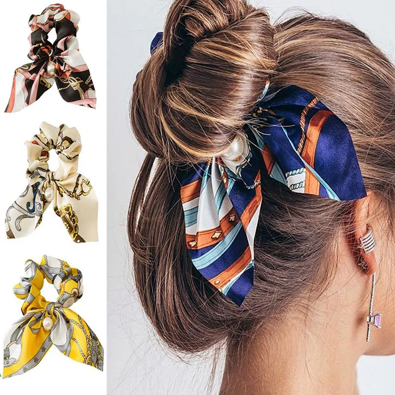 Резинки для волос женские, шифоновые, шелковые, с бантом и жемчугом...