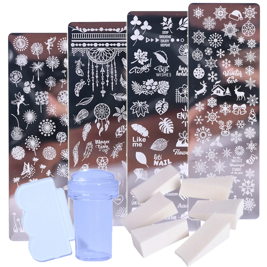 Пластины для штампов для дизайна ногтей, лак для ногтей, печать лист, цветок, Ловец снов, снежинка, Рождественский штамп, скребок, губка, JISTZN01-12-2, 1 комплект