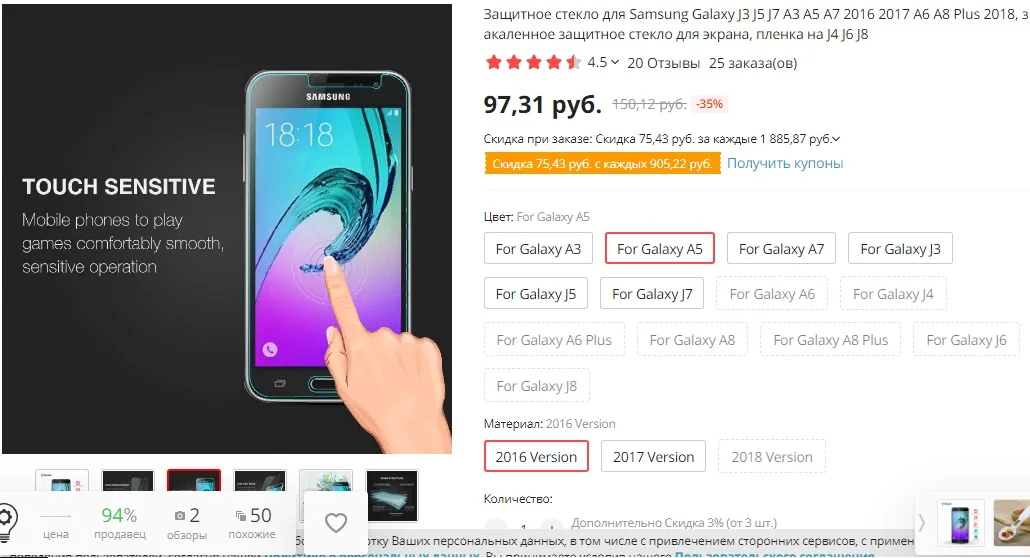 Меня этот заказ очень разозлил. Из-за 102 рублей целая история. Во-первых, ждала очень долго 1,5 -2 месяца. Во-вторых, размер пришел не верный. В-третьих, открыла спор, а мне пишут, что отправили все верно на мой Самсунг А 5 2016г стекло. А то что экран не закрывает это чудо-товар им все равно. Прикладываю фото , которое в их описании, и как у меня стекло легло.