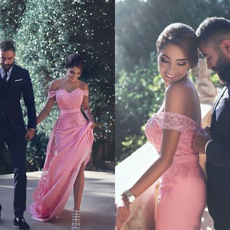Женское вечернее платье-русалка, розовое атласное платье с открытыми плечами и кружевной аппликацией, для выпускного вечера