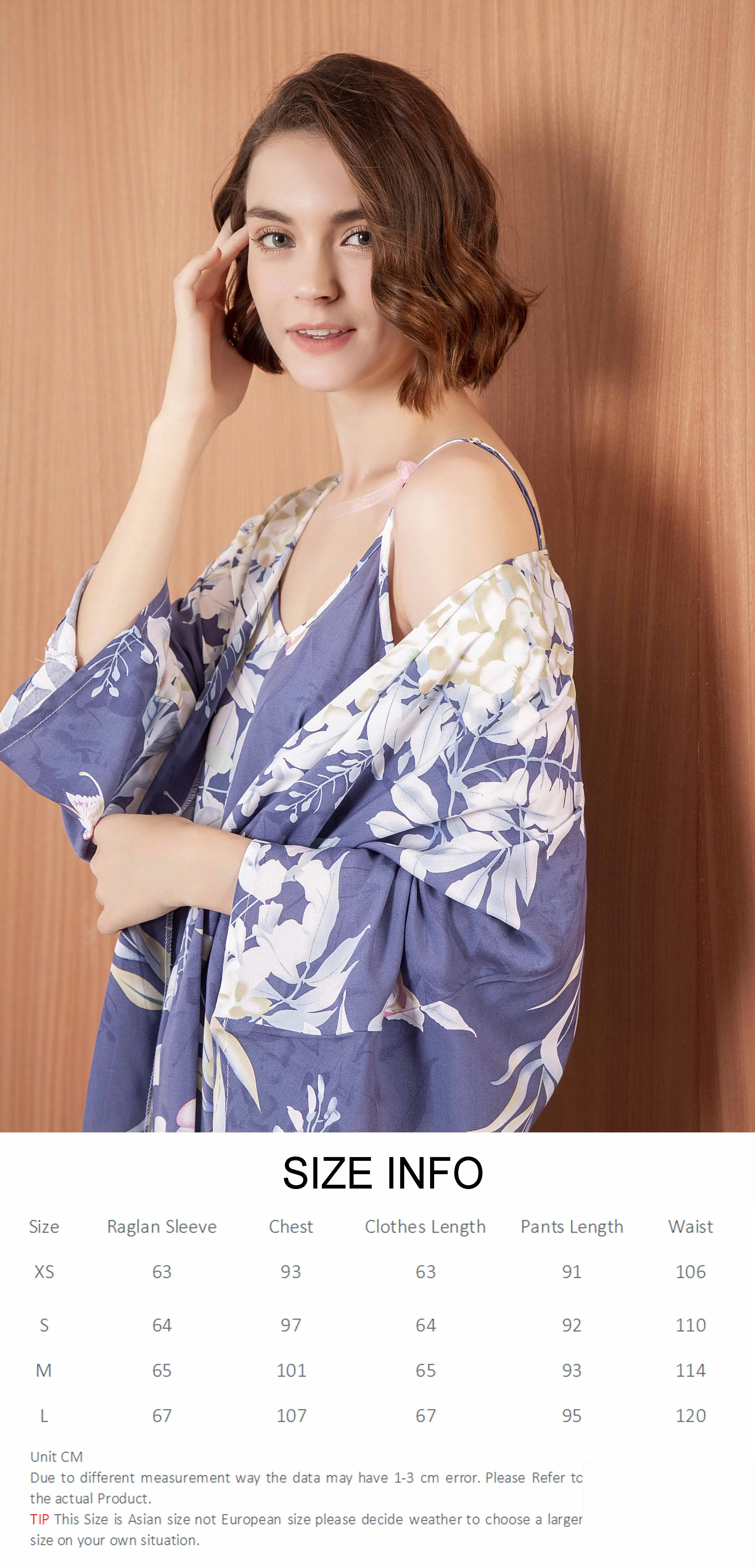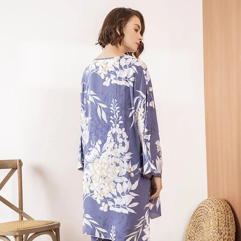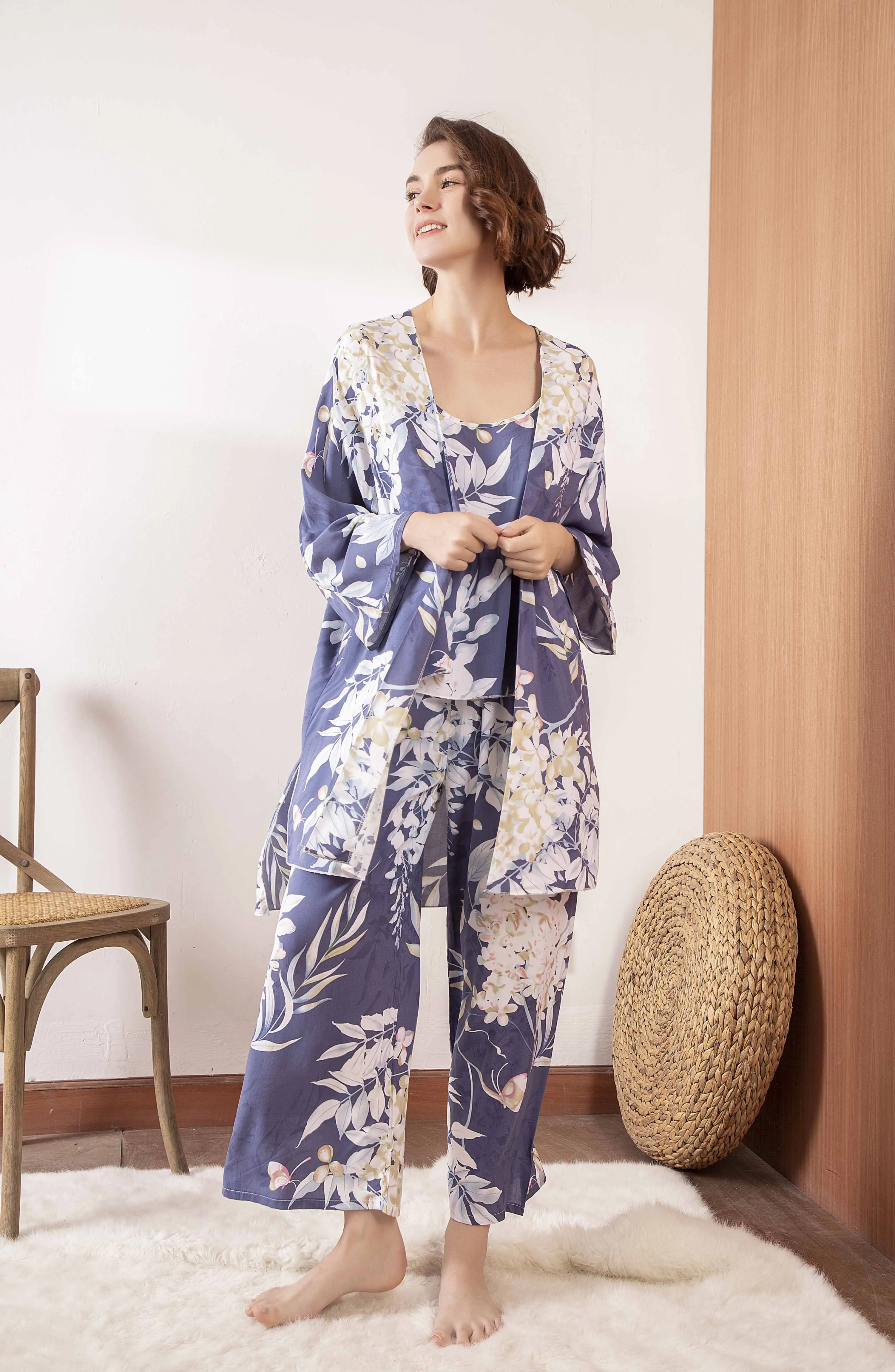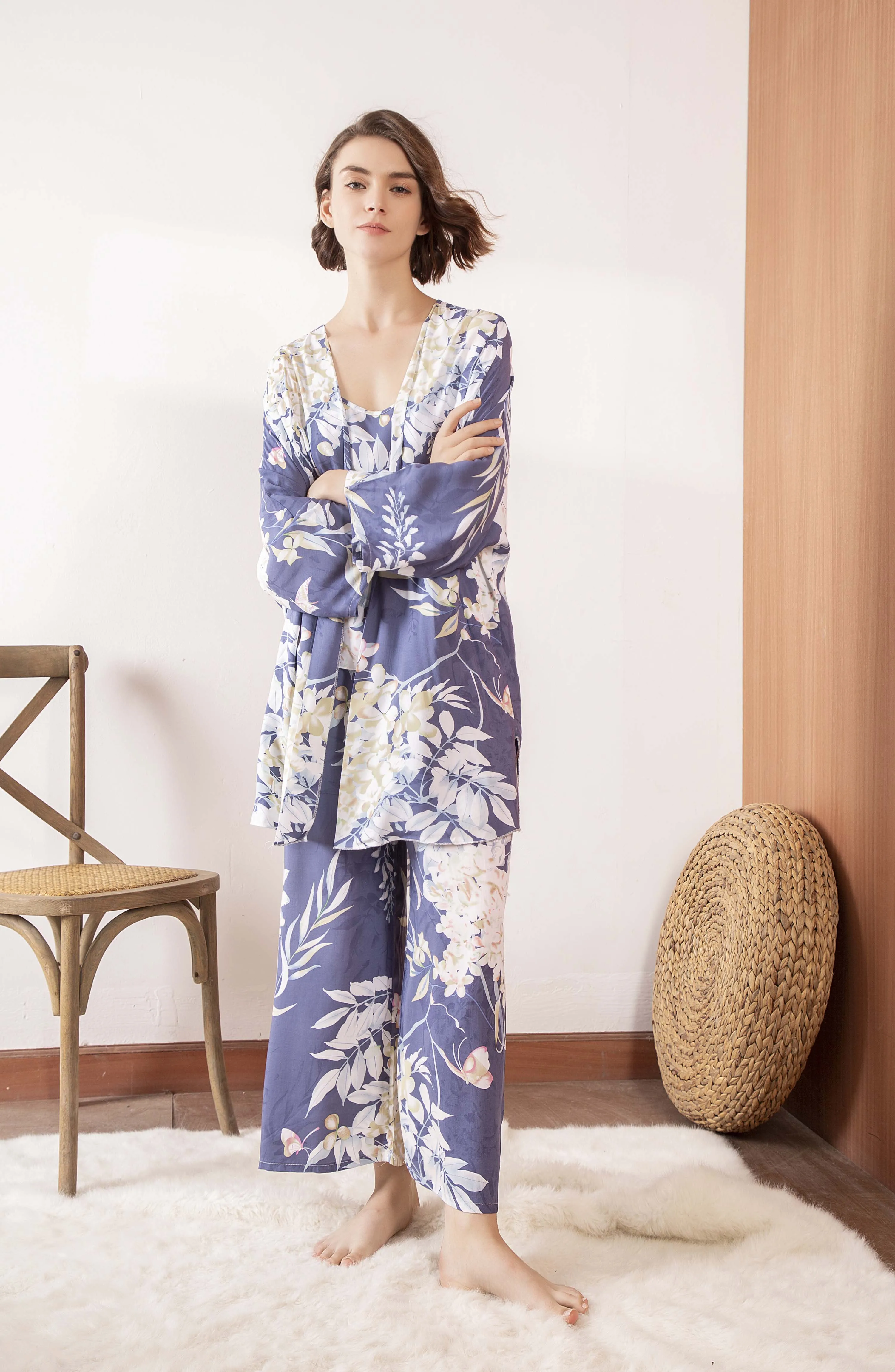 Женский Осенний пижамный комплект, элегантный синий комплект с цветочным принтом, свободная удобная одежда для сна из 3 предметов, кардиган, кофта и штаны, домашняя одежда