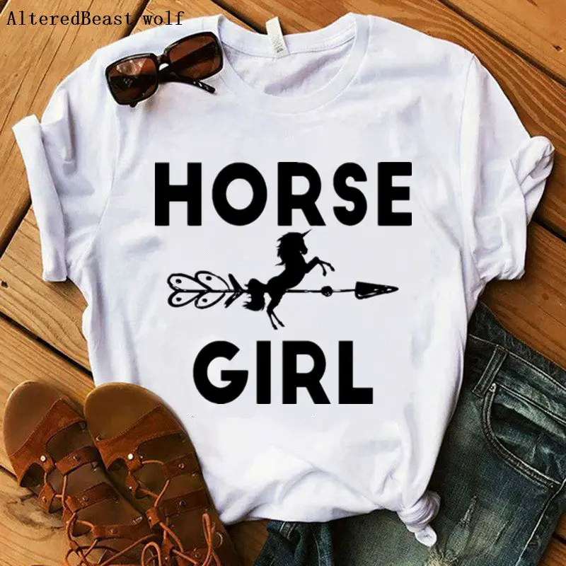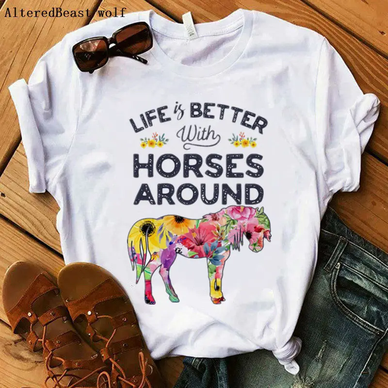 Женская одежда 2019, белая футболка в стиле Харадзюку с коротким рукавом и круглым вырезом, Женская Повседневная забавная Футболка с принтом лошадей, топы