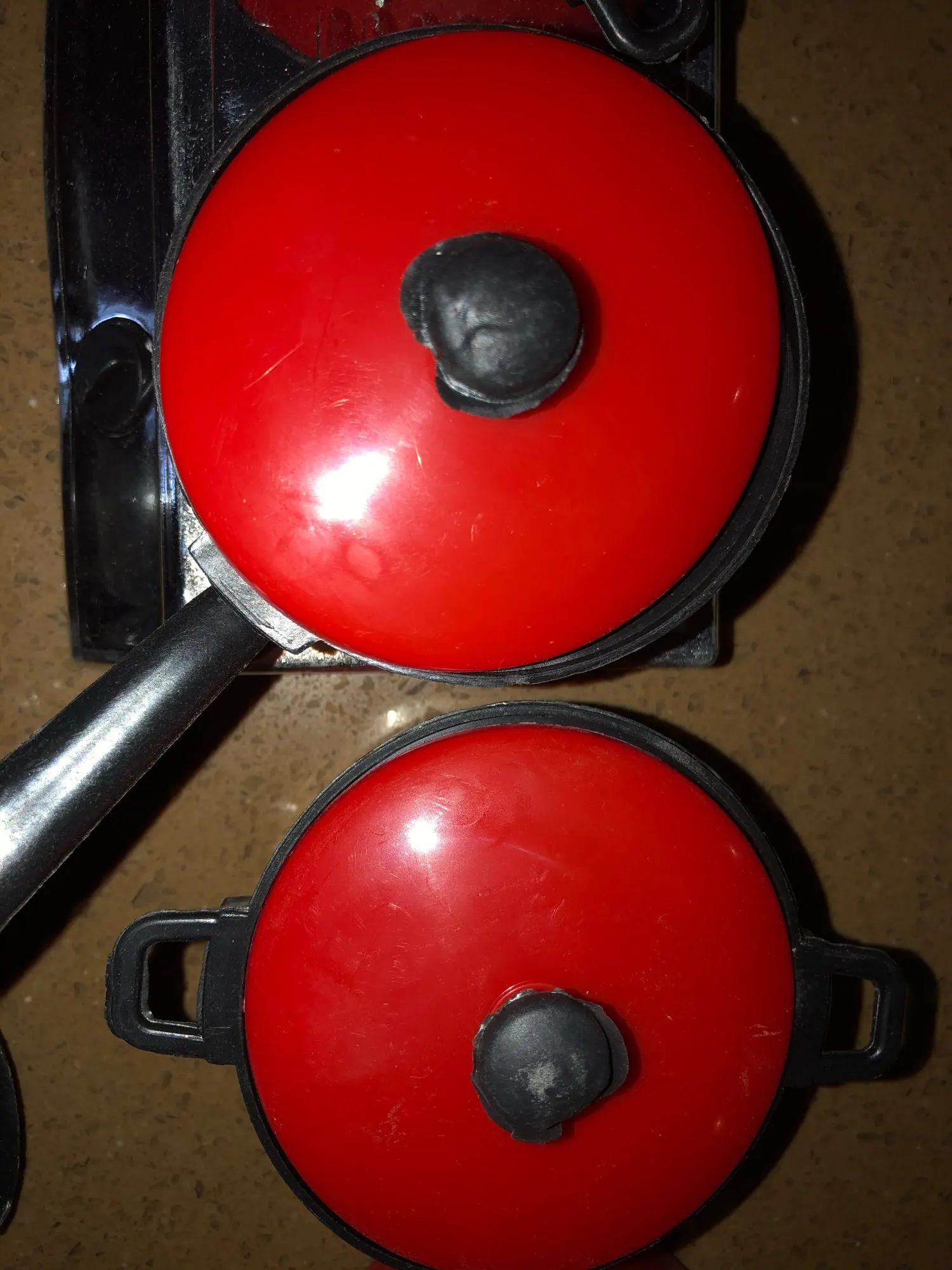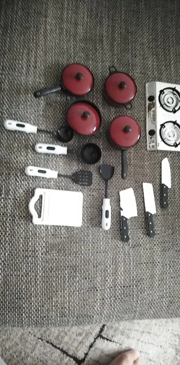 Неаккуратно обработаны - острые края нужно срезать/подпилить. Мелкие детали - крышечки кастрюль - не закреплены, ребенок может подавиться.