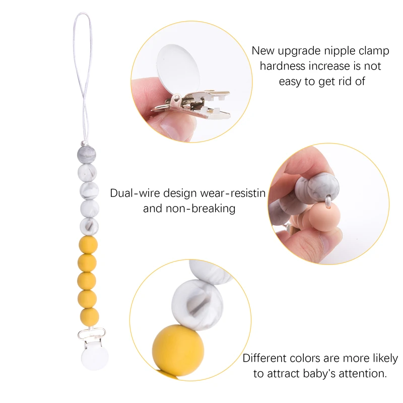 Материал изделия: силиконовые бусины + металлический зажим Метод производства: ручная работа Количество: 1 шт. Цвет: 6 видов цветов Применение: аксессуары для детских сосок