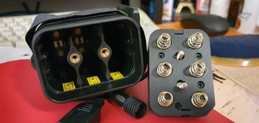 Жаба душила - штука за коробочку... К ночи понты разыгрались - и придавили жабу. Покупка прискакала мухой, за три дня. Можно ставить 2, 4 и 6 аккумов. Сбоку зазор миллиметр, 21700 не влезут. В крышечке преобразователь 8,4/5. А заодно и индикатор заряда. Фигня, а приятно. Манжетка в крышке никакая, герметичность под вопросом. Угол срублен - ключ. Работа 3sp2 сильно облегчает жизнь дешманским аккумам. И по сравнению с самопалом - девайс изящнее на порядок. Но возможно, туда пригодился бы удлинитель.