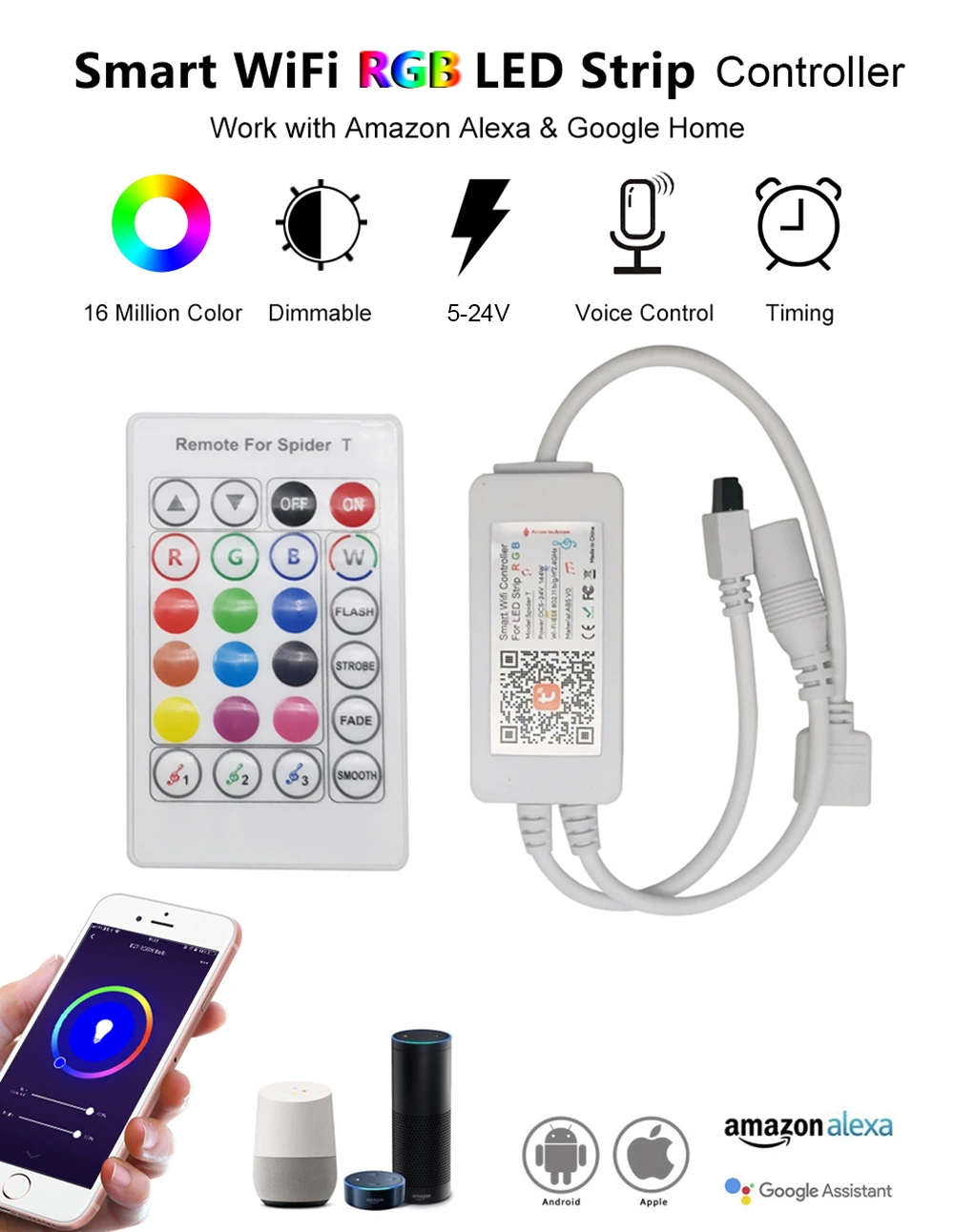 1. Управляйте rgb-полоской 3 способа-используя этот умный контрольный светильник с помощью ленты RGB светильник, получите 3 способа управления вашим светильник:[Alexa Mode/Google Assistant/Tmall Genie] говорите с Amazon Alexa Echo/Google Assistant/Tmall Genie, вы можете попросить светильник включить/выключить, изменить цвета или тусклый.[Режим Wi-Fi] Управляйте светильник с помощью смартфона через приложение «eWeLink».[Пульт дистанционного управления] вы также можете управлять светодиодный светильник с помощью ИК-пульта с 24 кнопками.2. Сделайте ваш светильник 16 миллионов изменений цвета-получите ваш RGB светильник подключение полосы этого контроллера, он может сделать ваш светильник 16 миллионов изменений цвета и быть отрегулирован от 1% до 100% яркости вашего смартфона.3. Установите светильник, когда и где бы он ни был-ленивый, чтобы включить/выключить светильник? Просто подключите этот смарт-контроллер к полосе под светильник, установите режим таймера с помощью смартфона, вы можете составить соответствующий график, чтобы автоматически включить/выключить светильник для различных случаев, например, режим пробуждения или сна и т. Д. И вы также можете дистанционно контролировать светильник, где бы вы ни находились!Характеристики.:Название товара: светодиодный Wifi контроллерПоддерживаемая Платформа: Android / IOSМатериал: АБС-пластик VO (огнестойкий)Информация о дистанционном управлении: Инфракрасный, 24 клавишиВходная мощность: DC5V ~ 24V 144W Макс.