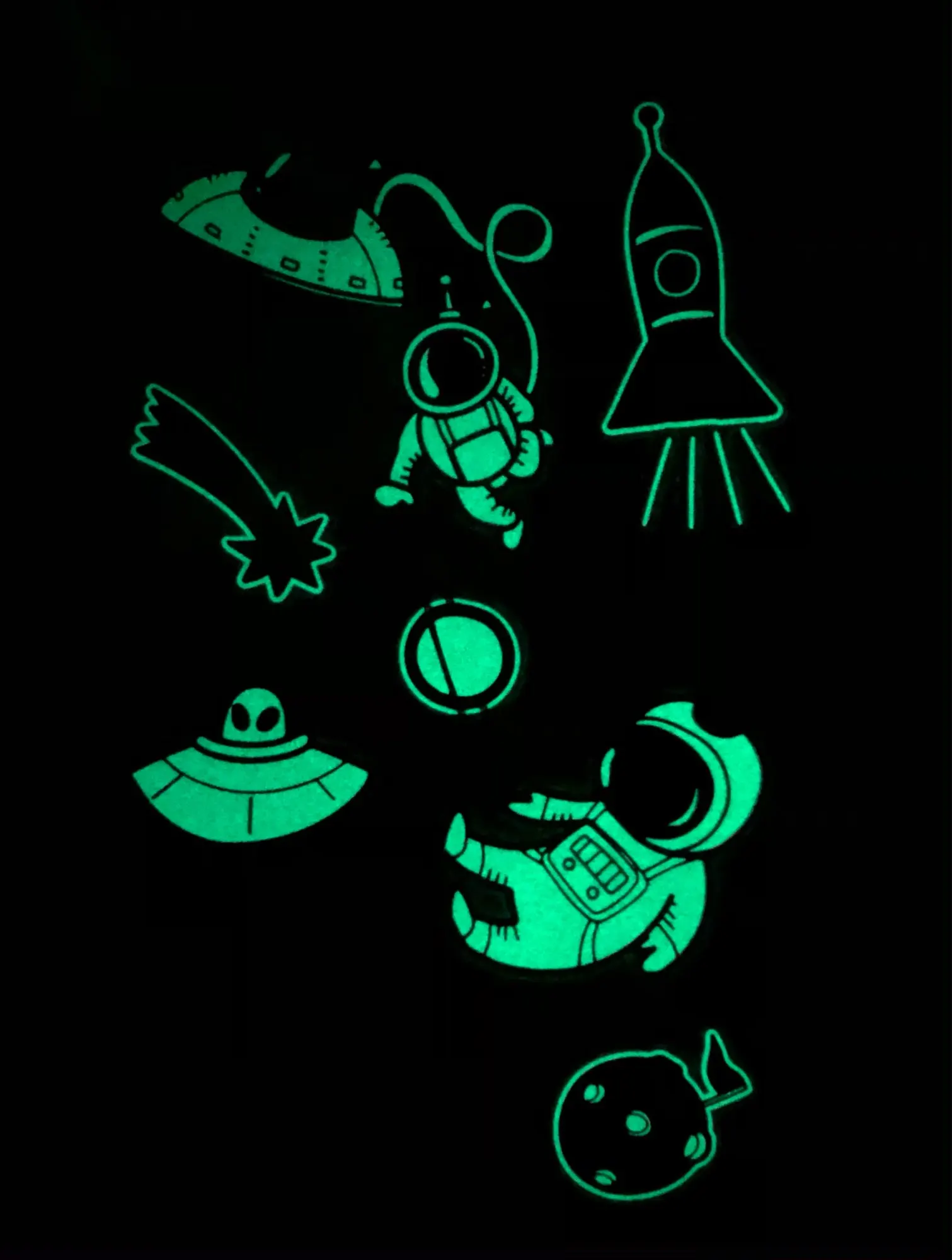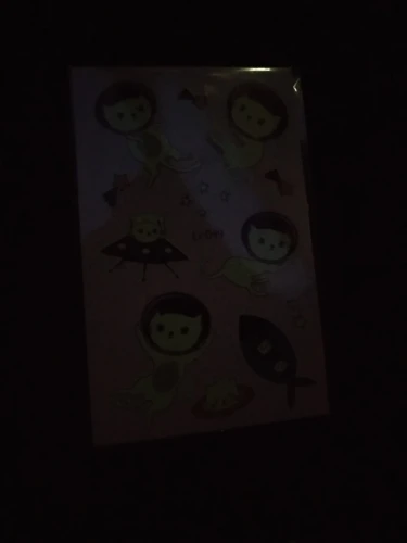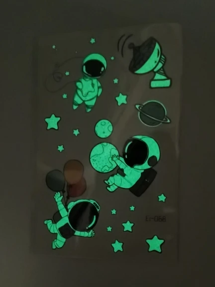 Наклейки светятся! Дети счастливы!))) Будут светиться ярче, если на пару секунд поднести к яркому источнику света, чем ярче источник, тем ярче будет потом светиться наклейка, постепенно становясь тускнее.