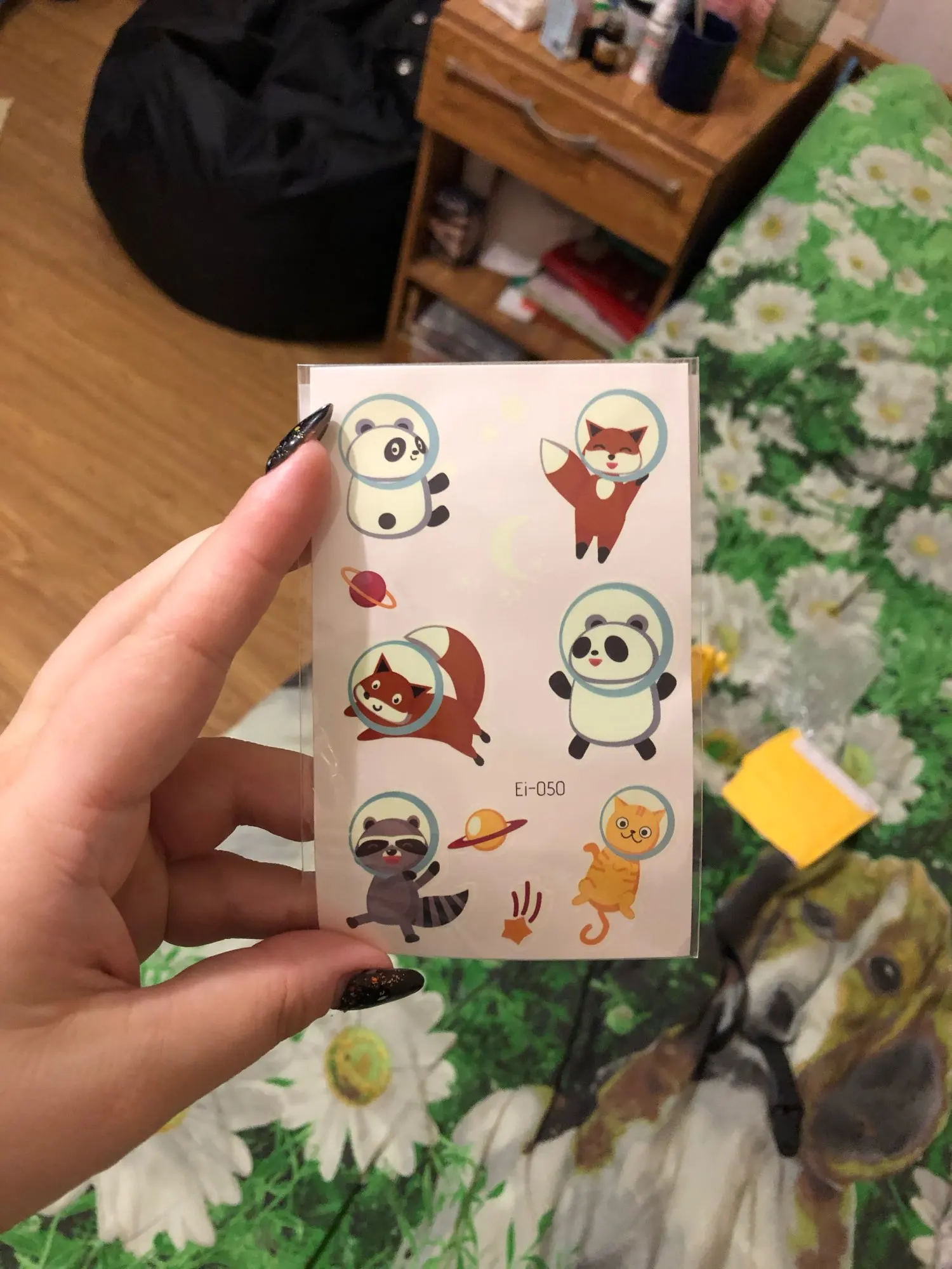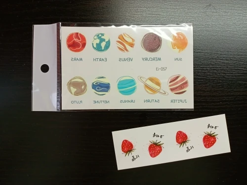 Хорошие наклеечки, пришли примерно за три недели. На кожу переносятся стандартно, держатся крепко, в темноте действительно светятся. Спасибо продавцу!