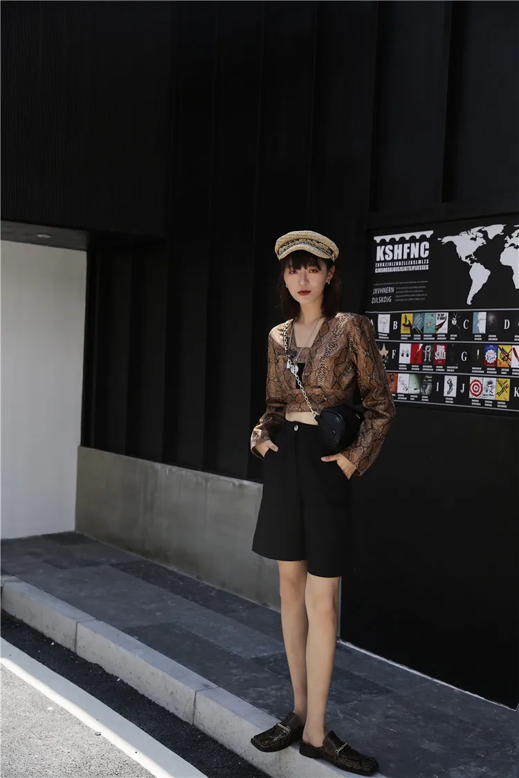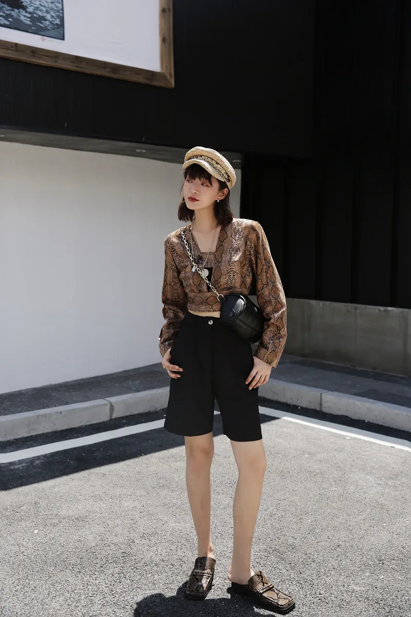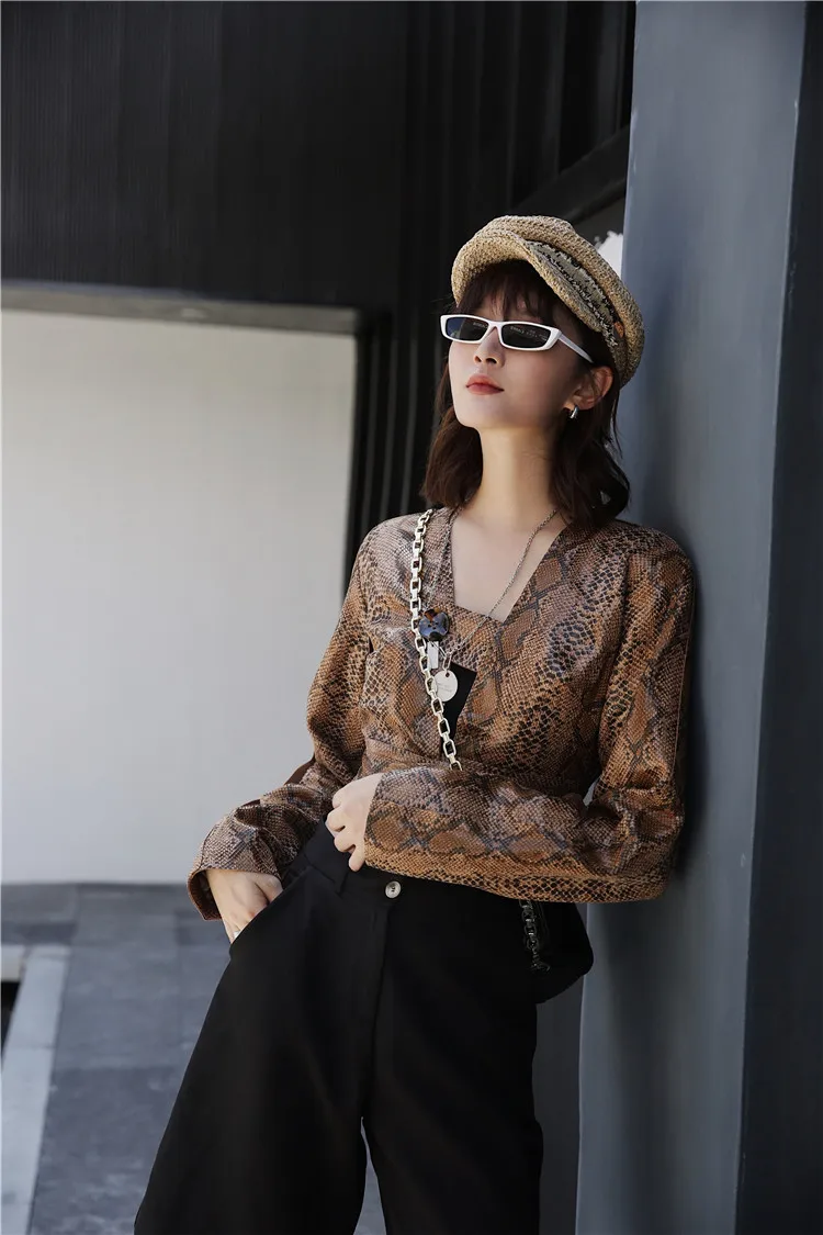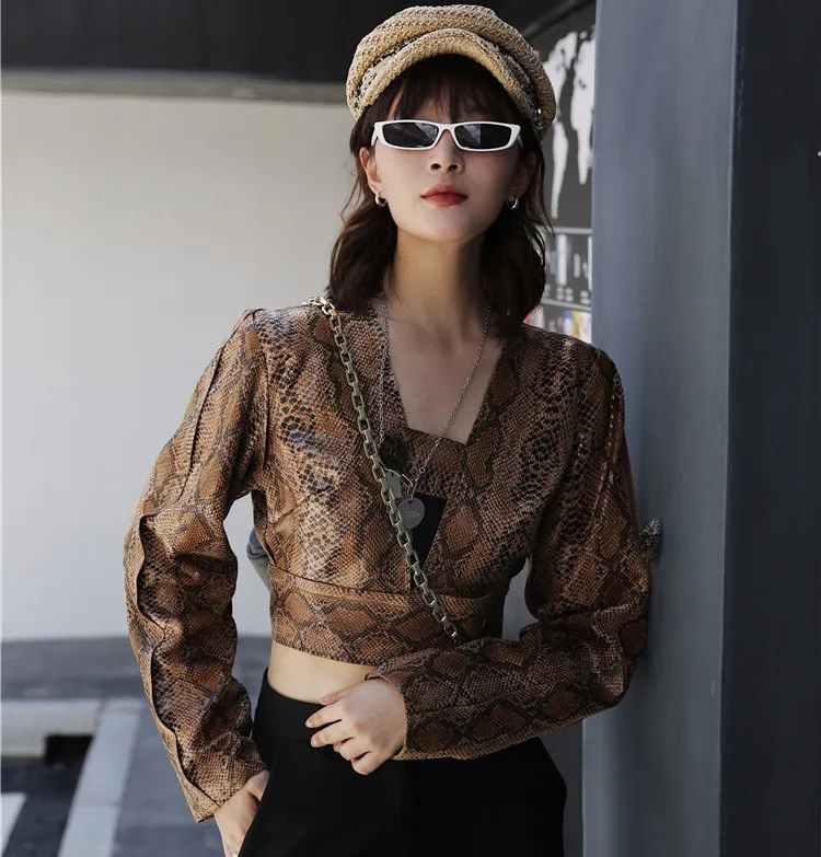 CHEERART, укороченная куртка с принтом змеиной кожи, женская кожаная куртка с V-образным вырезом, Укороченное пальто, женская модная куртка с длинным рукавом, одежда