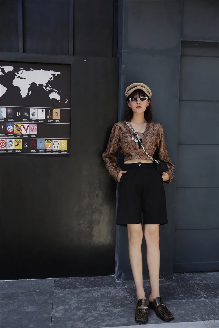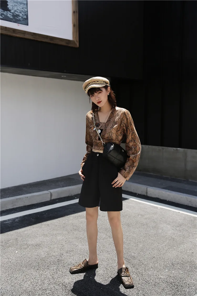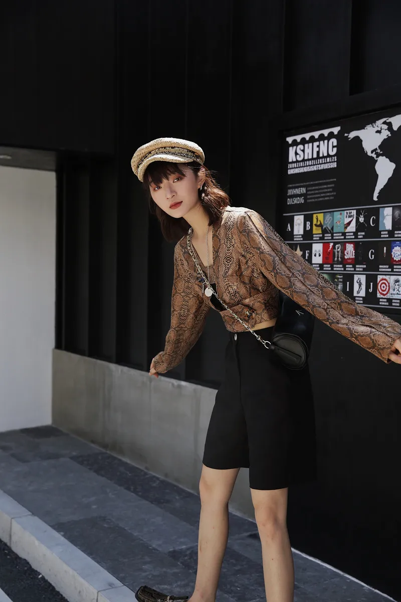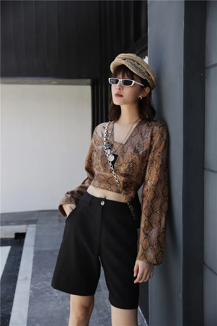 CHEERART, укороченная куртка с принтом змеиной кожи, женская кожаная куртка с V-образным вырезом, Укороченное пальто, женская модная куртка с длинным рукавом, одежда