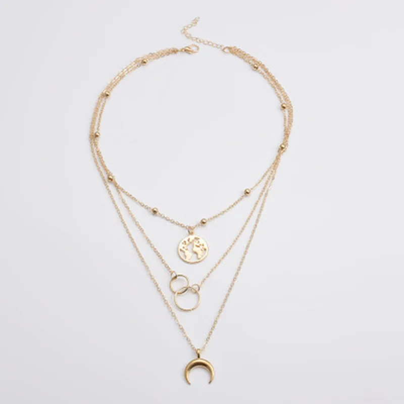 Ожерелье многослойное золотистое с подвеской в виде месяца, карты мира