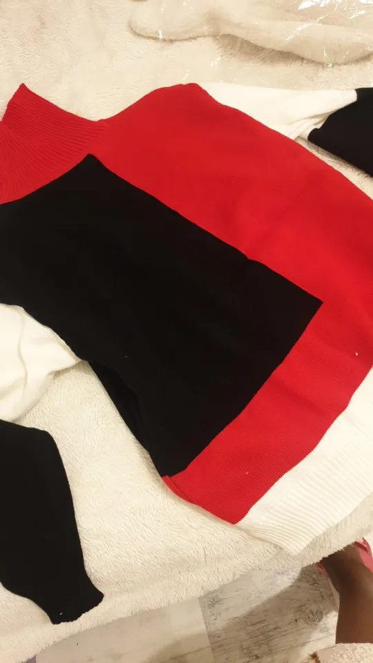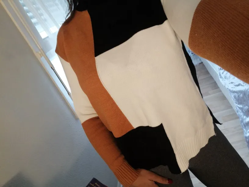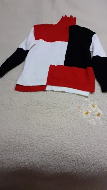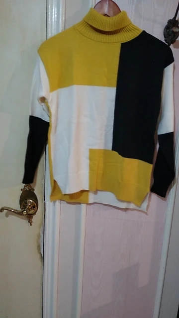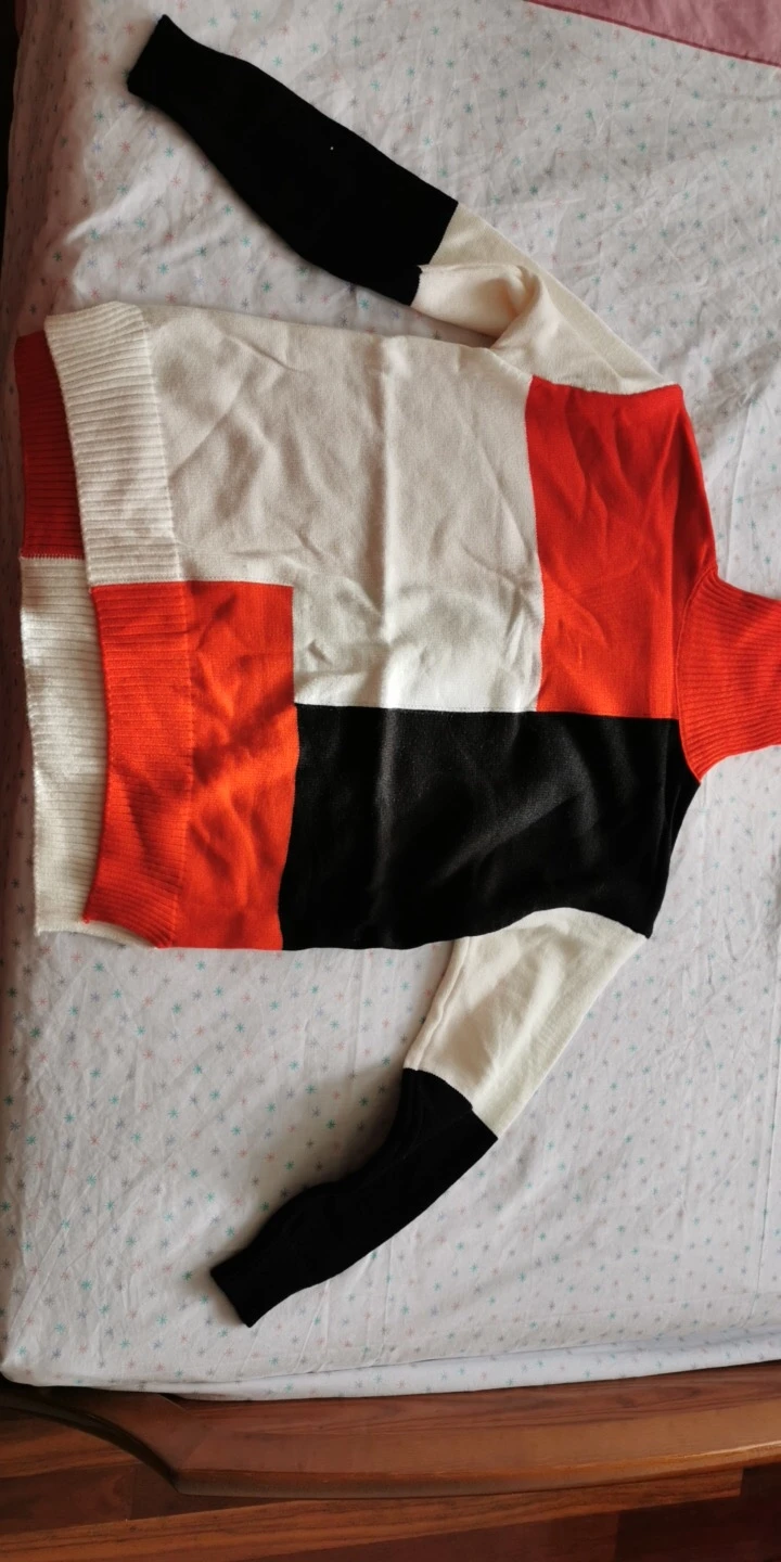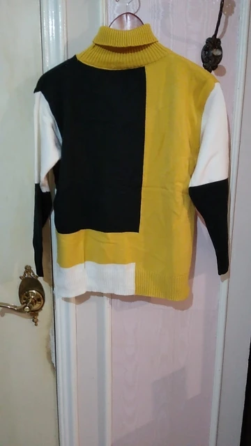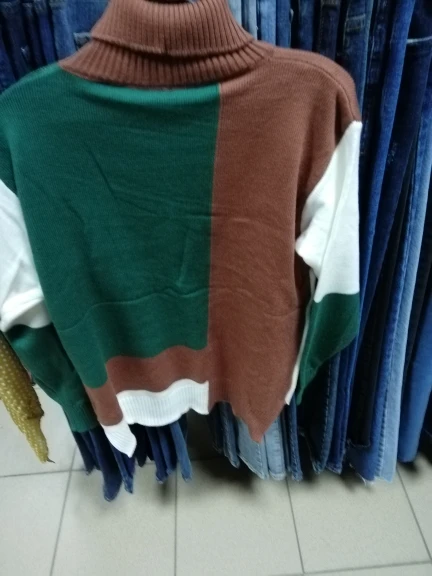 Элегантный, оригинальный по дизайну, тёплый свитер. На русскую зиму нормально. На 46 размер взяла L. Но у меня большой бюст, выглядит по фигуре. Порадовала расцветка, нигде не встречала такого экстравагантного оформления, сочетания цветов в стиле Малевича. Всем советую!