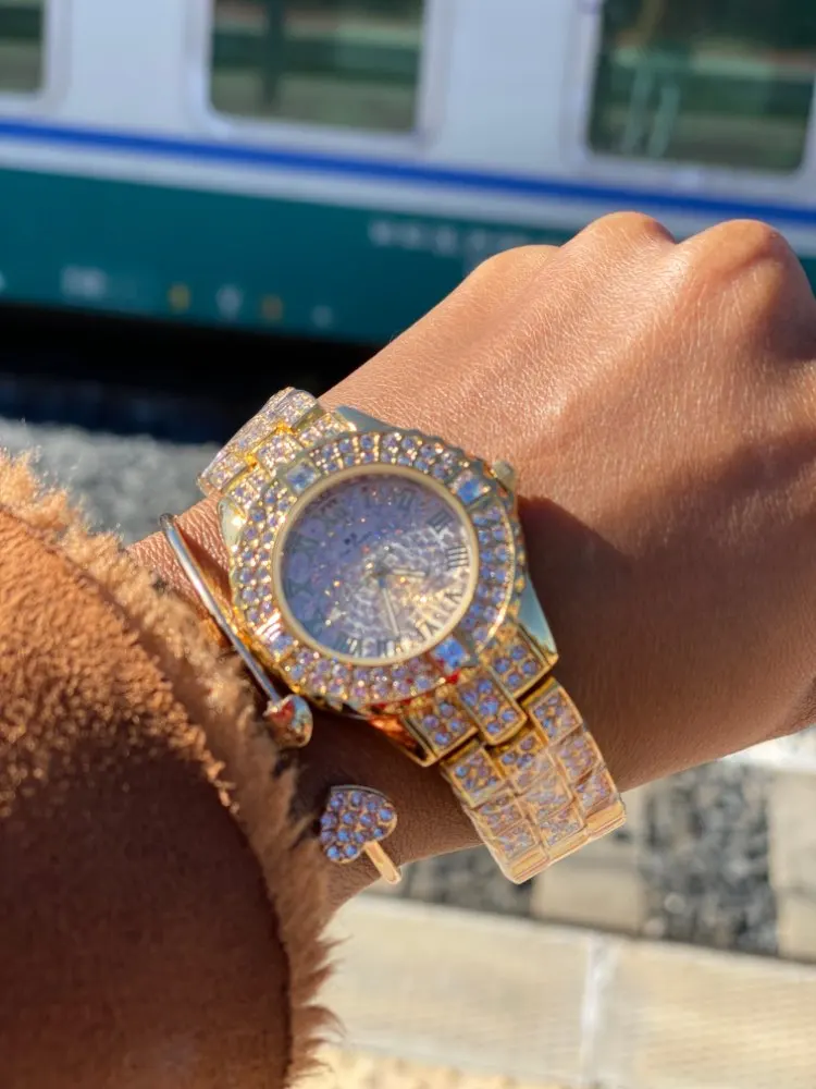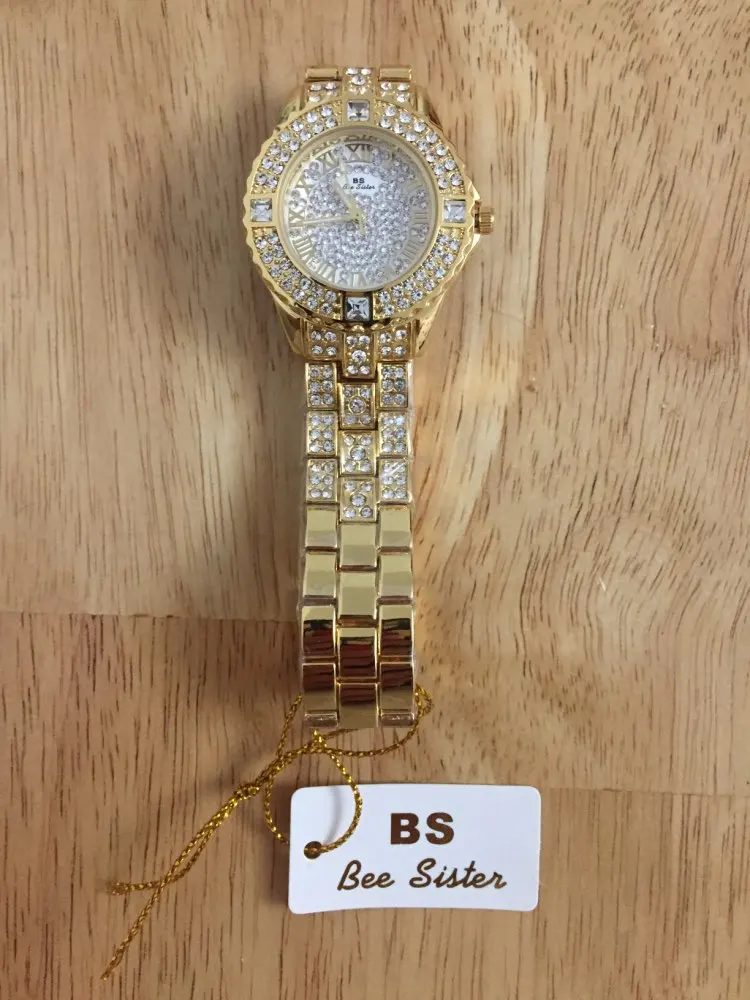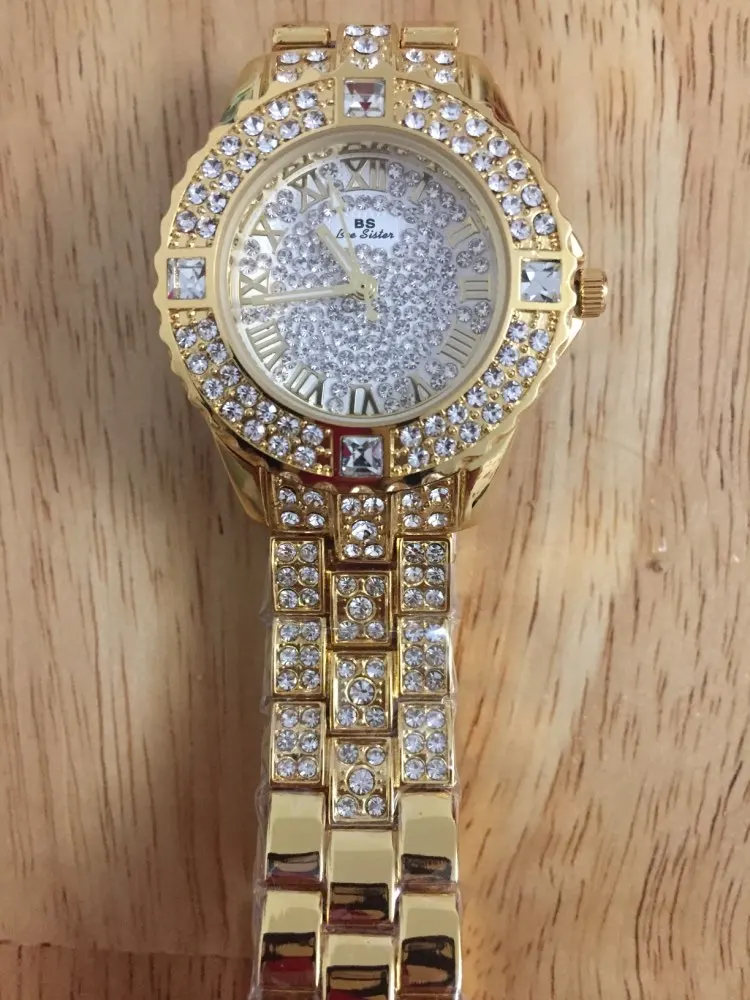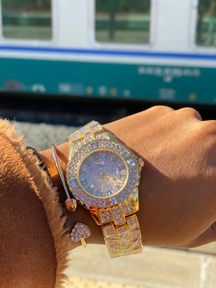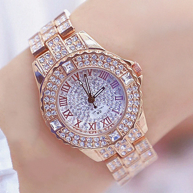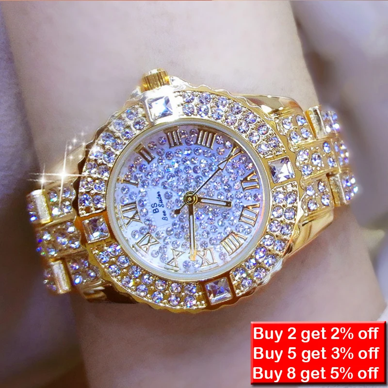 Часы наручные стразы женские с бриллиантами, брендовые роскошные золотистые, с браслетом