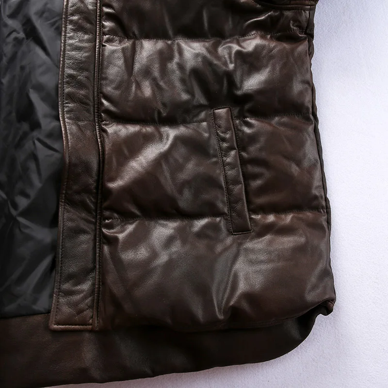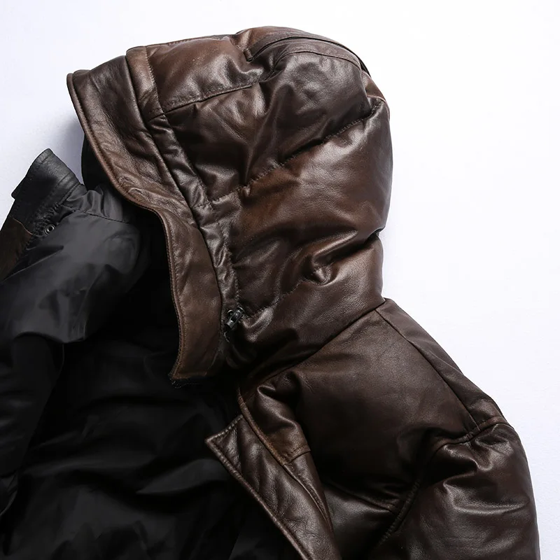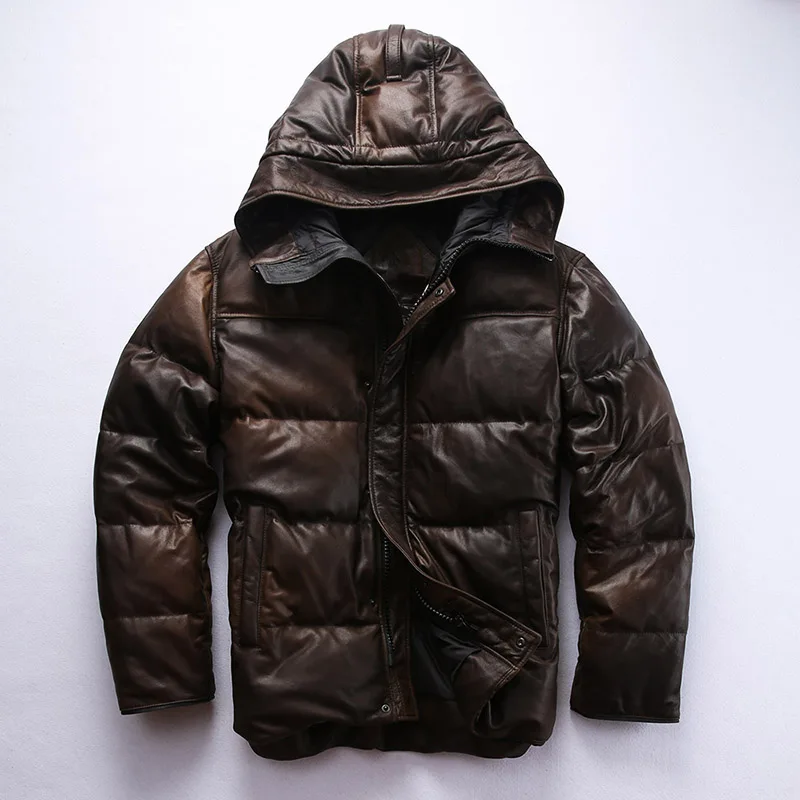 Пуховик мужской из натуральной кожи, коричневого цвета, с капюшоном, для русской зимы, 2019
