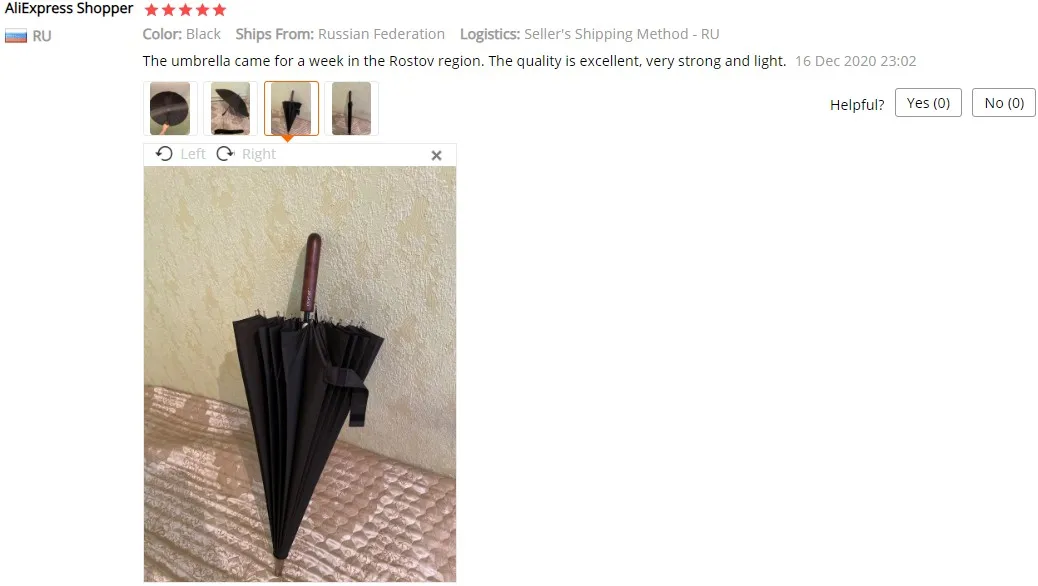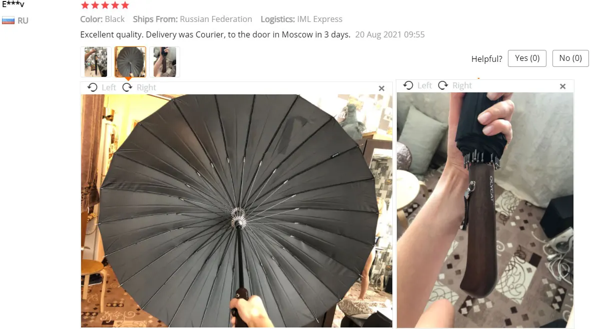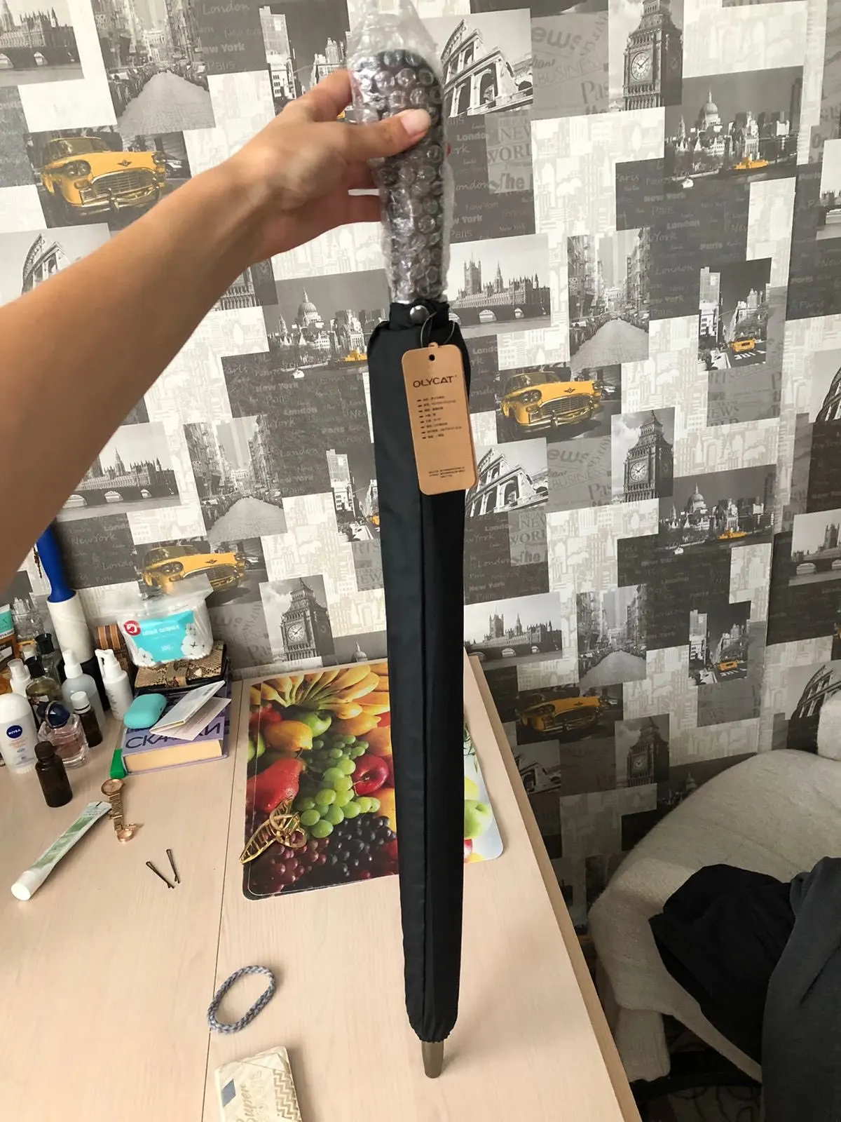 Зонт интересный, выглядит на первый взгляд отлично, ничего не люфтит, не болтается, в руке сидит уверенно и приятно! Как поведет себя на практике время покажет, проверить пока небыло возможности, но в Питере обещают грозы со дня на день, вот и проверим))). Минус - долгая просроченная доставка, но это косяк не продавца, а нашей российской службы доставки... Продавец молодец! Я пока доволен, буду ждать дождей...)) Всем добра!!!))