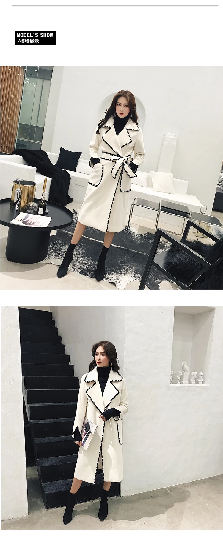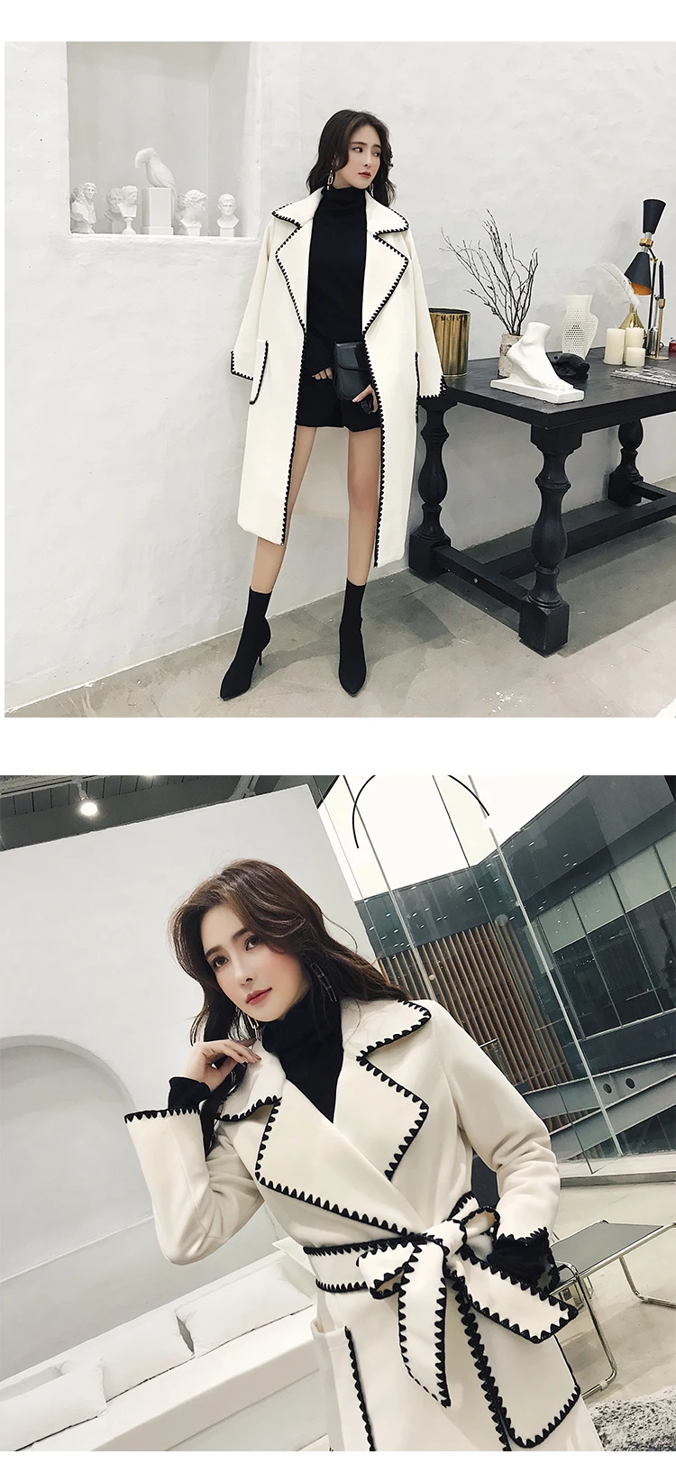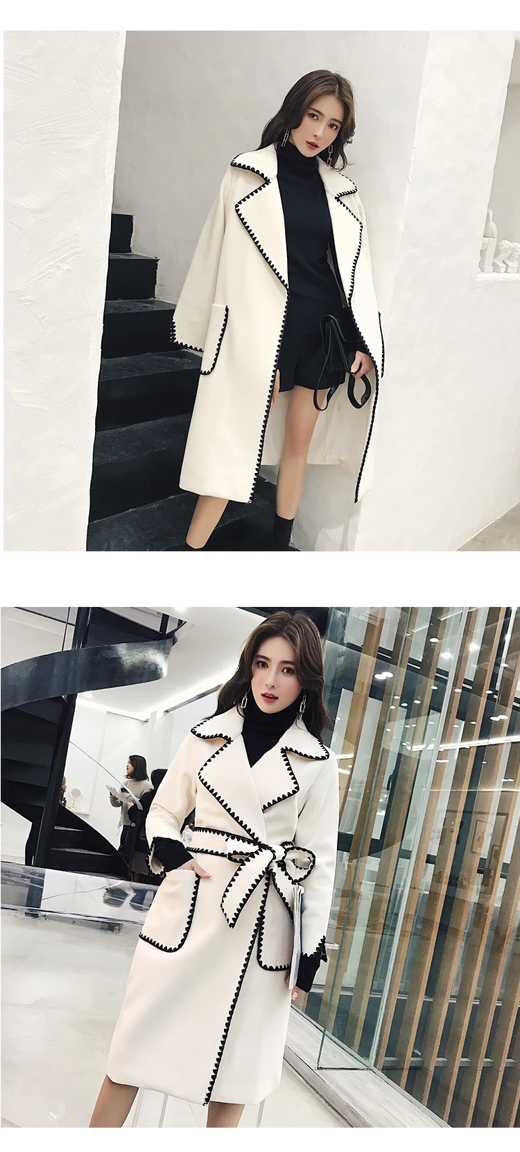 Женская Длинная шерстяная куртка, длинное пальто с волнистыми боковыми вышивками, пальто с отложным воротником и длинными рукавами, толстая верхняя одежда с карманами и поясом, Осень-зима 2021
