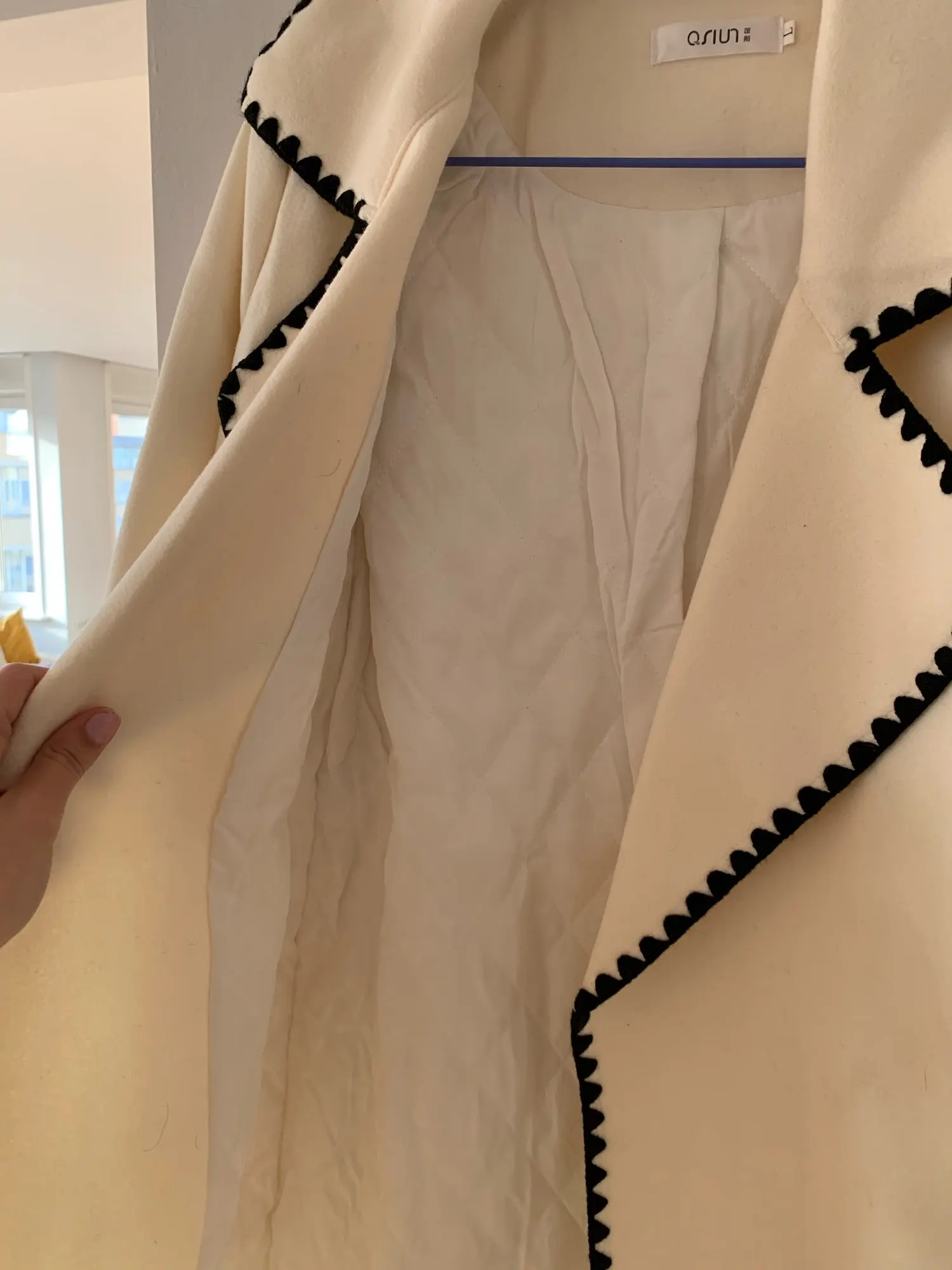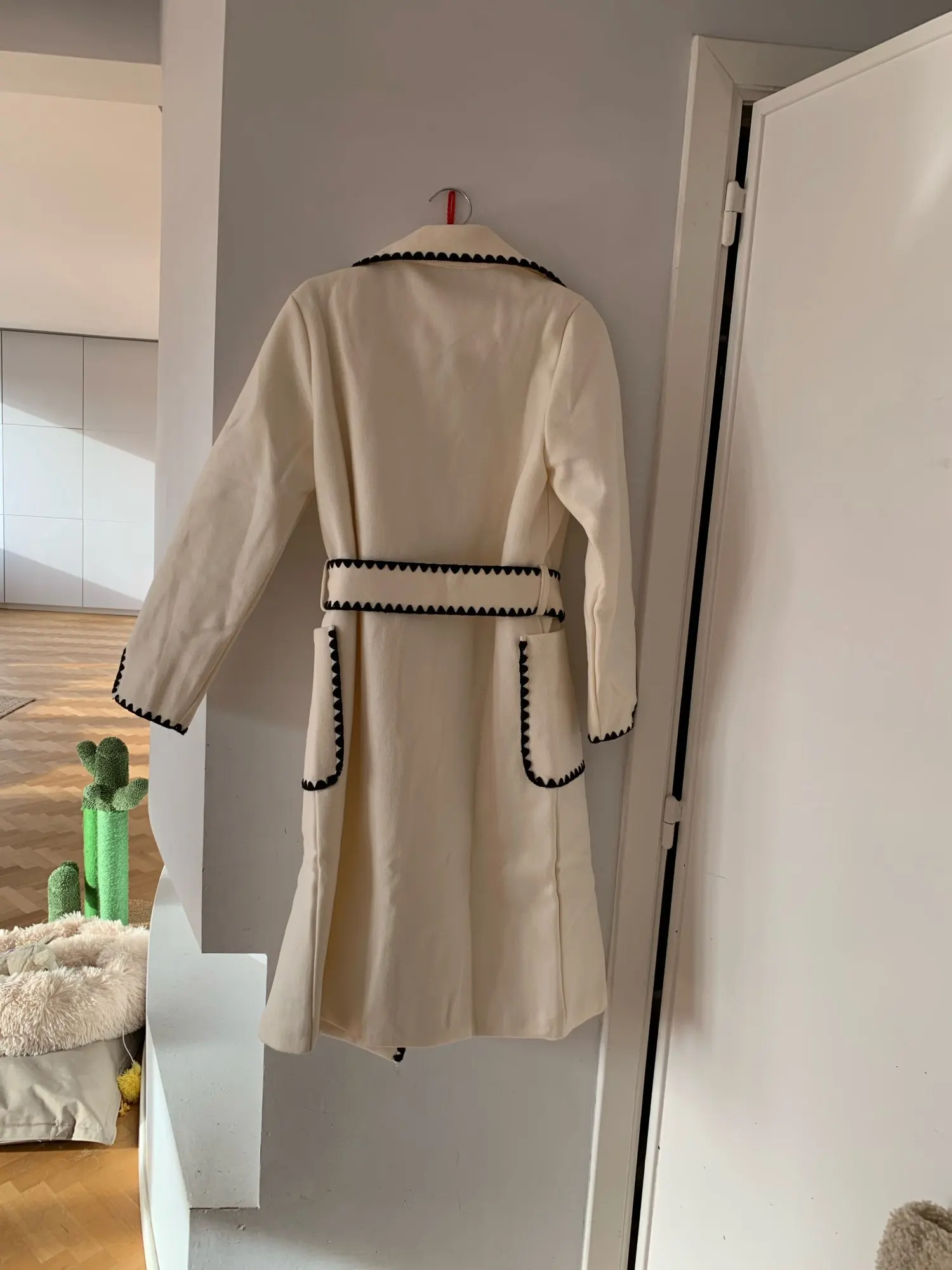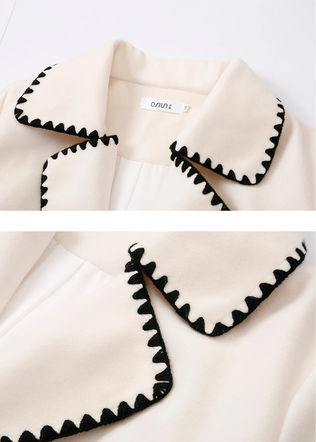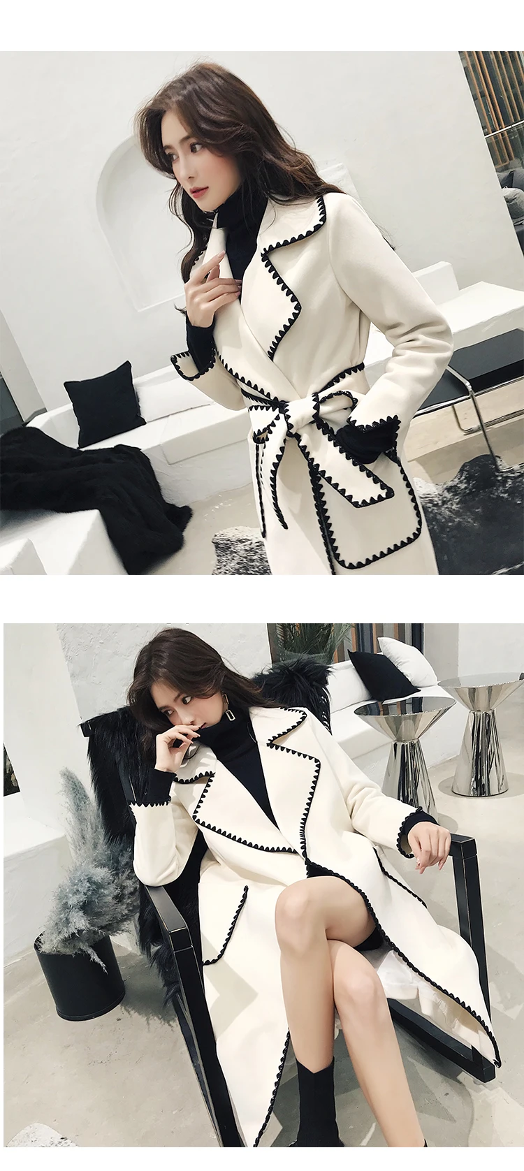 Женская Длинная шерстяная куртка, длинное пальто с волнистыми боковыми вышивками, пальто с отложным воротником и длинными рукавами, толстая верхняя одежда с карманами и поясом, Осень-зима 2021