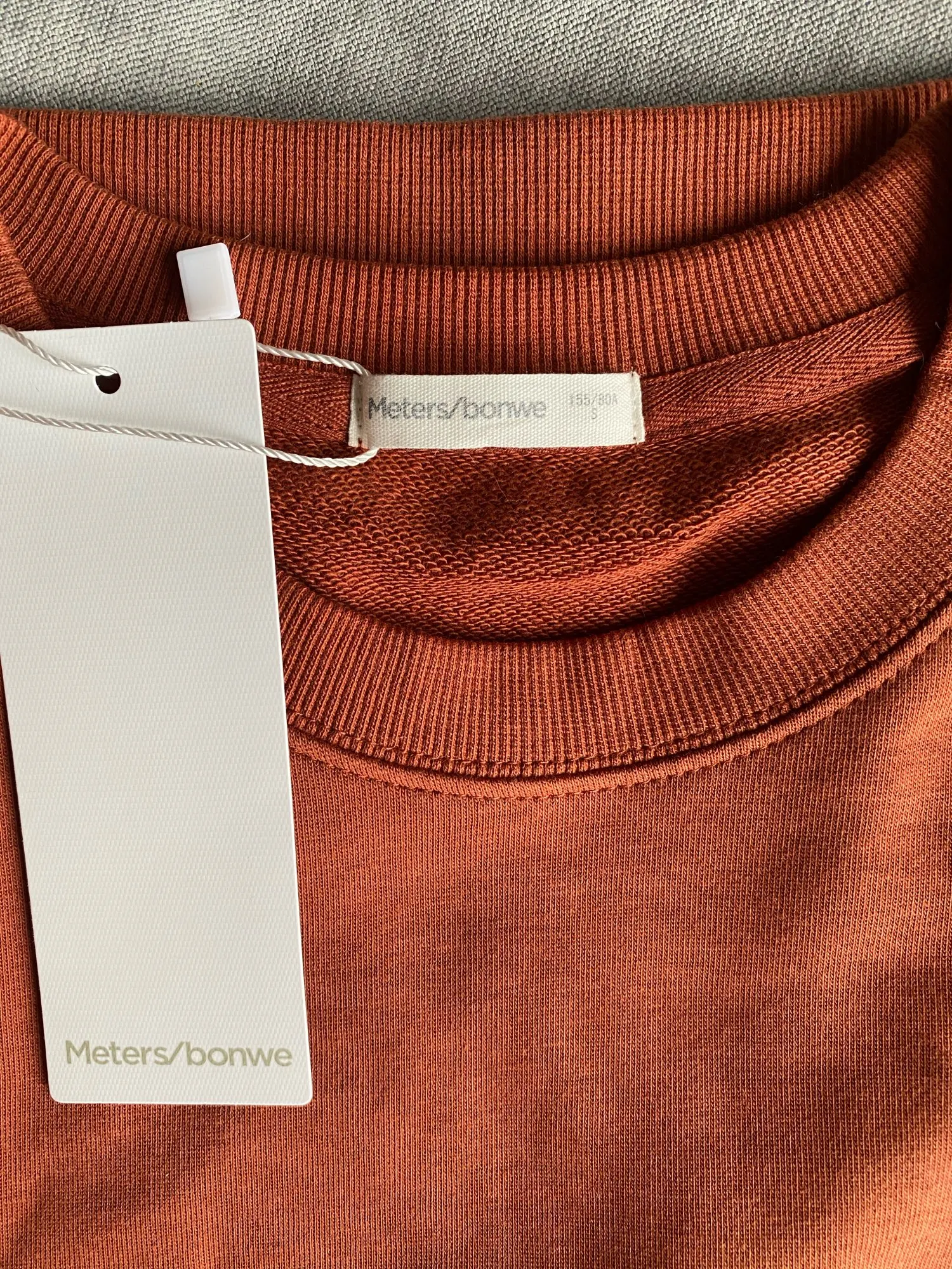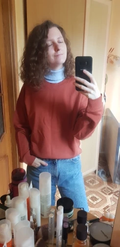 Покупаю второй свитшот - все нравится. Пошит аккуратно, наощупь приятный, 85% хлопка. Плотный, но не особо теплый. Цвет приятный, но телефон правильный оттенок не улавливает. На самом деле он менее рыжий и более глубокий. На 84-61-91 размер М сидит достаточно объемно.