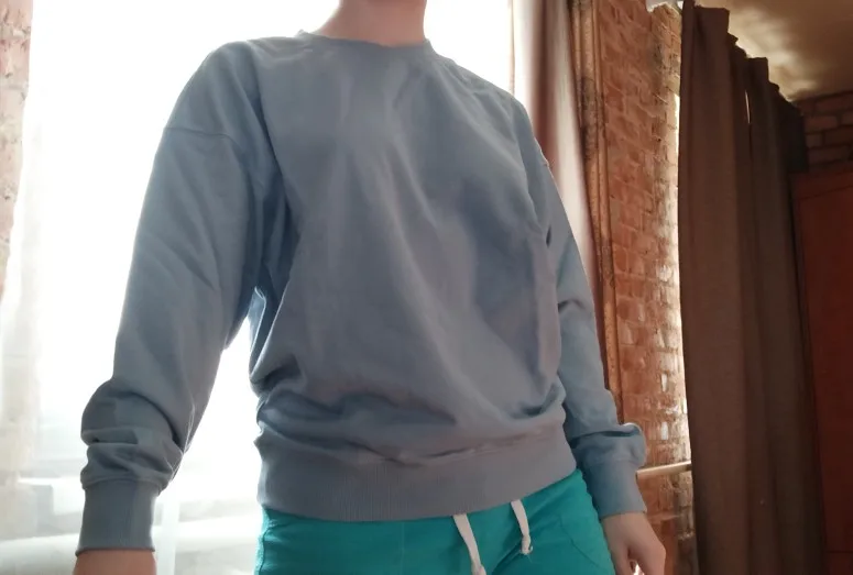 Свитшот пришел с браком. Впереди белое сквозное пятно, как от белизны. Сразу же открыла спор, часть денег вернули. Все равно очень расстроена, так как свитшот класнный, планировала его носить до холодов. Он сшит качественно! Все прошито практически идельно. Ткать плотная, поэтому смело можно носить ранней осенью. До захолустного села городского типа в Красноярском крае посылка шла меньше месяца. За это отдельный плюс! На параметры 152 83-63-91 подошел идеально, рукав с запасом. Попробую как-нибудь опять заказать такой же свитшот, может повезет и обойдется все без "сюрпризов":)