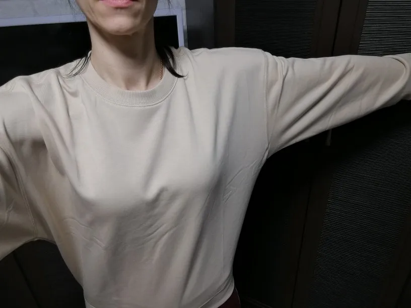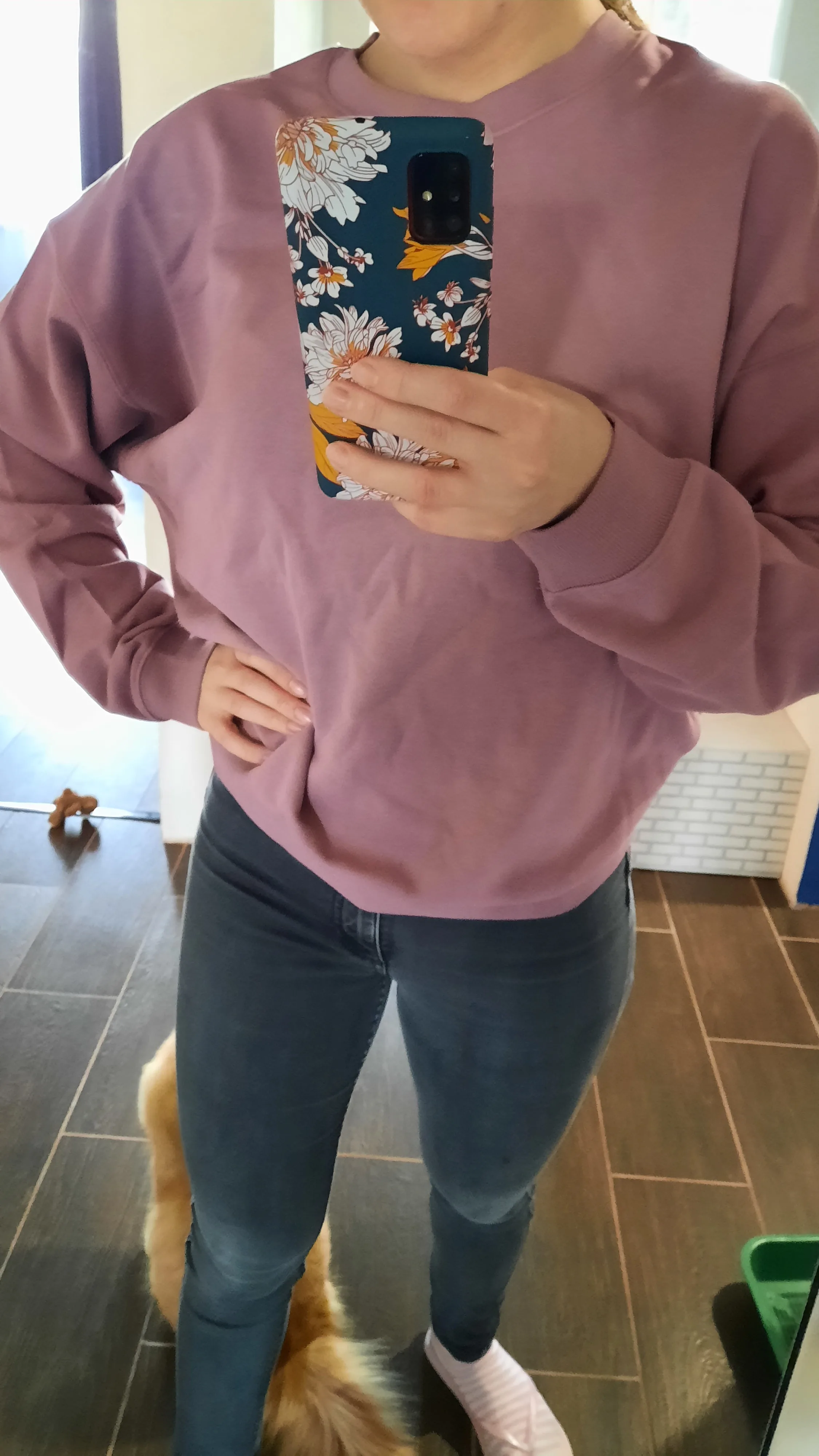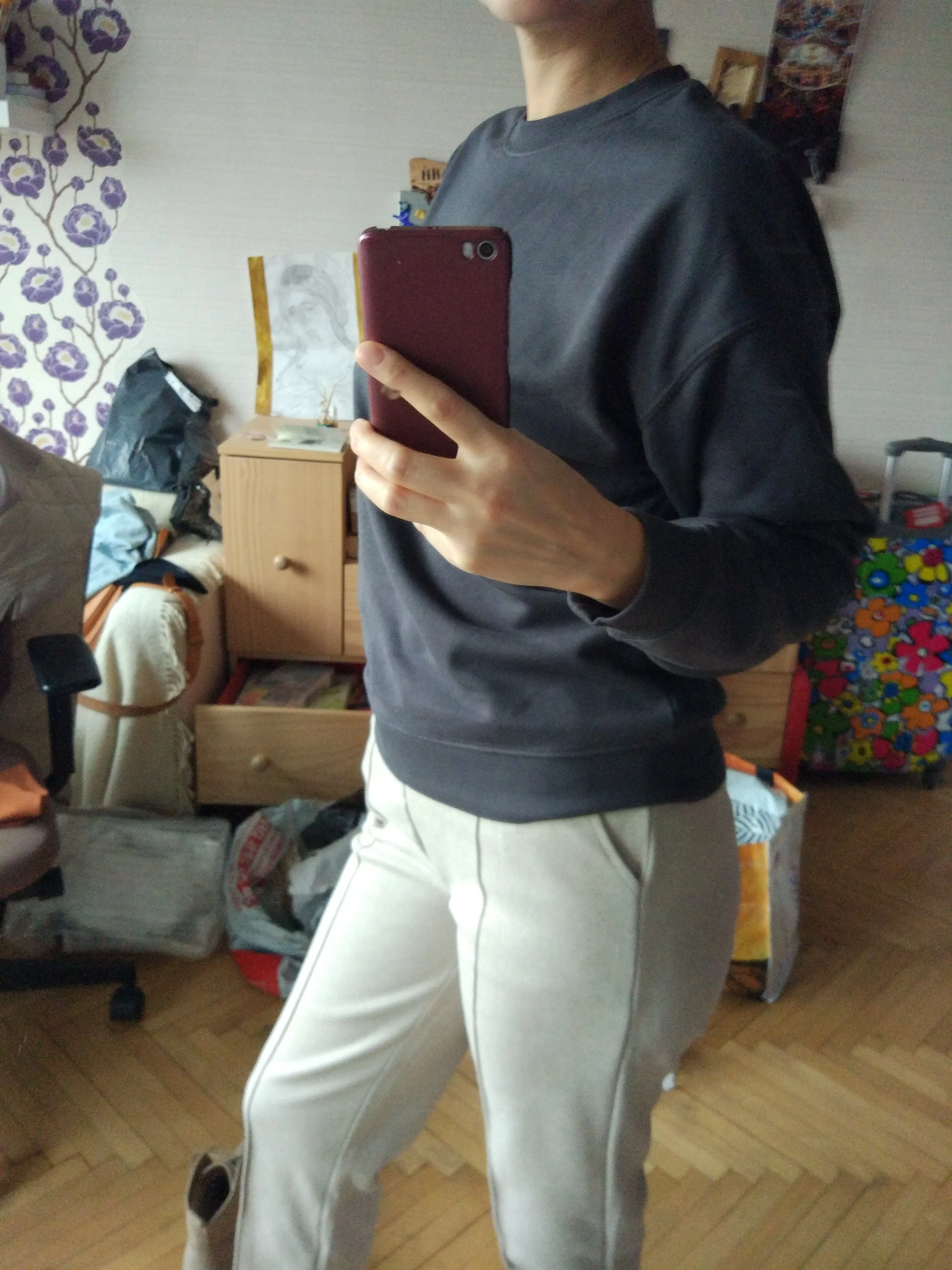 Свитшот просто супер. Ткань очень приятная, качественно сшито. Шерсть не липнет, судя по всему, быстро не растянется и катышек быть не должно. Нормальная длинна, на рост 170 чуть ниже талии (на фото подвернут), рукав такой, как и должен быть.