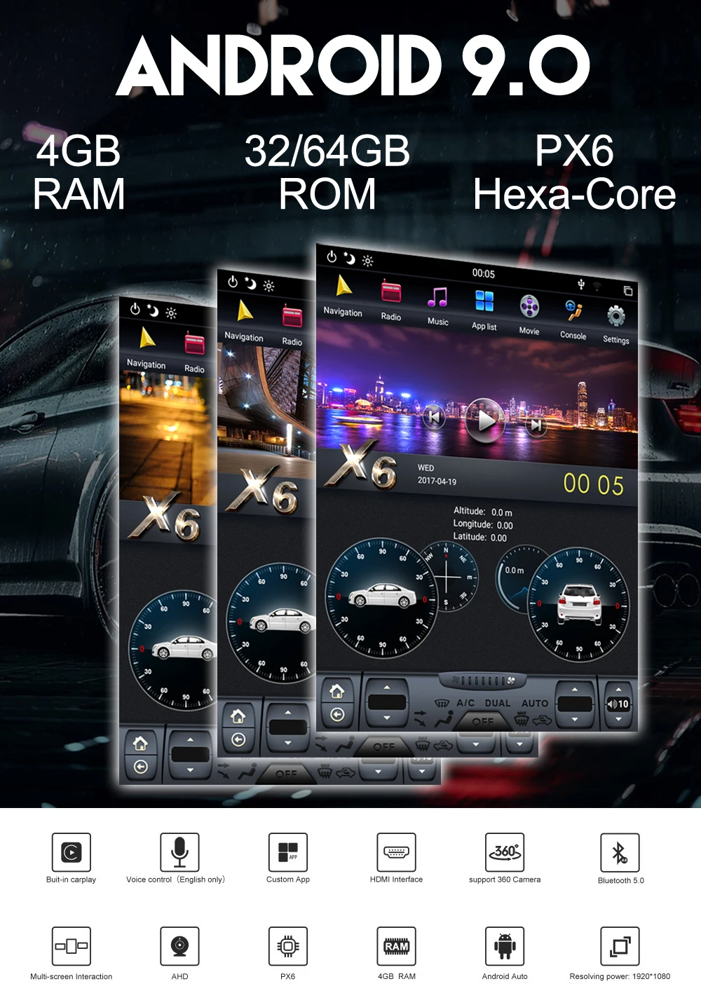 Android 9,0RAM:4 Гб RAM:64 ГБRockchip PX6(RK3399) шесть ядерДвойной Cortex-A72 (1,8 ГГц) Quad Cortex-A53 (1,4 ГГц)Чип усилителя: TDA7851Радио тюнер IC:NXP 6686