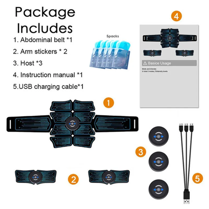 Особенности: 1. 6 режимов и 10 Частота тока: EMS стимулятор мышц имеет 6 режимов и 10 текущую частоту уровня для удовлетворения ваших ежедневных упражнений. Режим 1-2, ток НИЗКИЙ, он предназначен для сжигания жира; 3-4 режима тока умеренный, это лучше для роста мышц; 5-6 модный ток сильный, это обеспечивает сильные эластичные движения для укрепления мышц вашего тела. Вы получите результаты на АБС в течение не более 3 месяцев. 2. Usb-кабель 3 в 1, эффективная зарядка: В отличие от других продавцов, Брюшная лента поддерживает зарядку USB 3 в 1. Его можно заряжать с помощью безопасного и легкого подключения от ноутбука, мобильного аккумулятора, портативного зарядного устройства, автомобильного блока питания. Когда полностью заряжен (время зарядки составляет около 30 минут), он используется для около 3 раз (время работы-20 минут). 3. Около 20-30 минут в день: он приравнивается к 1500 м бега, 60 минут сидений, 30 минут бесплатного плавания, мы рекомендуем вам улучшать свой рацион и поддерживать чистоту тела без пота. Описание: Материал: ПЭТ-полимерный гель Подкладка: полиакриламид Глицерин на дистанционном управлении: АБС-пластик EMS устройства: Перезаряжаемые Мощность источник Вход: 100-240 В пер. тока, 50/60 Гц Выход: DC5V 1000mA Посылка в комплект входит: 1 x брюшный пояс 2 x ремни для рук 3 x контроллер 1x3-в-1 USB кабель для зарядки 1 x Руководство пользователя 10 шт., сменные гелевые прокладки (5 упаковок)