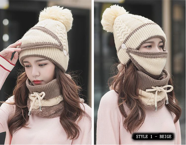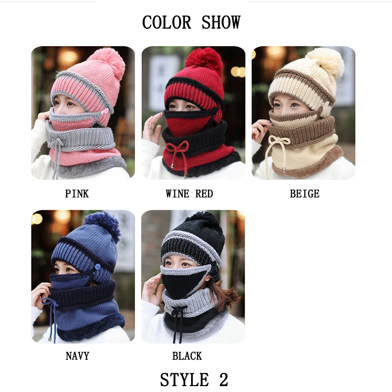 Вязаные шапки, женские зимние вязаные шапочки, шапка, шарф, набор, маска для женщин, защита ушей, Skullies, шапка, теплый бархат, толстая, для верховой езды, шерстяная шапка