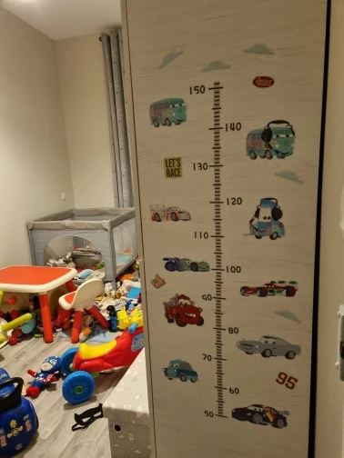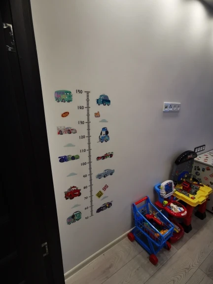 Дети в восторге! Все клеится отдельно. Машины можно сделать в произвольном порядке, как нравится самому. Немного отходят края, не очень качественная клеевая основа, но так держится. Правда, метки роста ставить не очень удобно, приходится отмечать на самой стене))