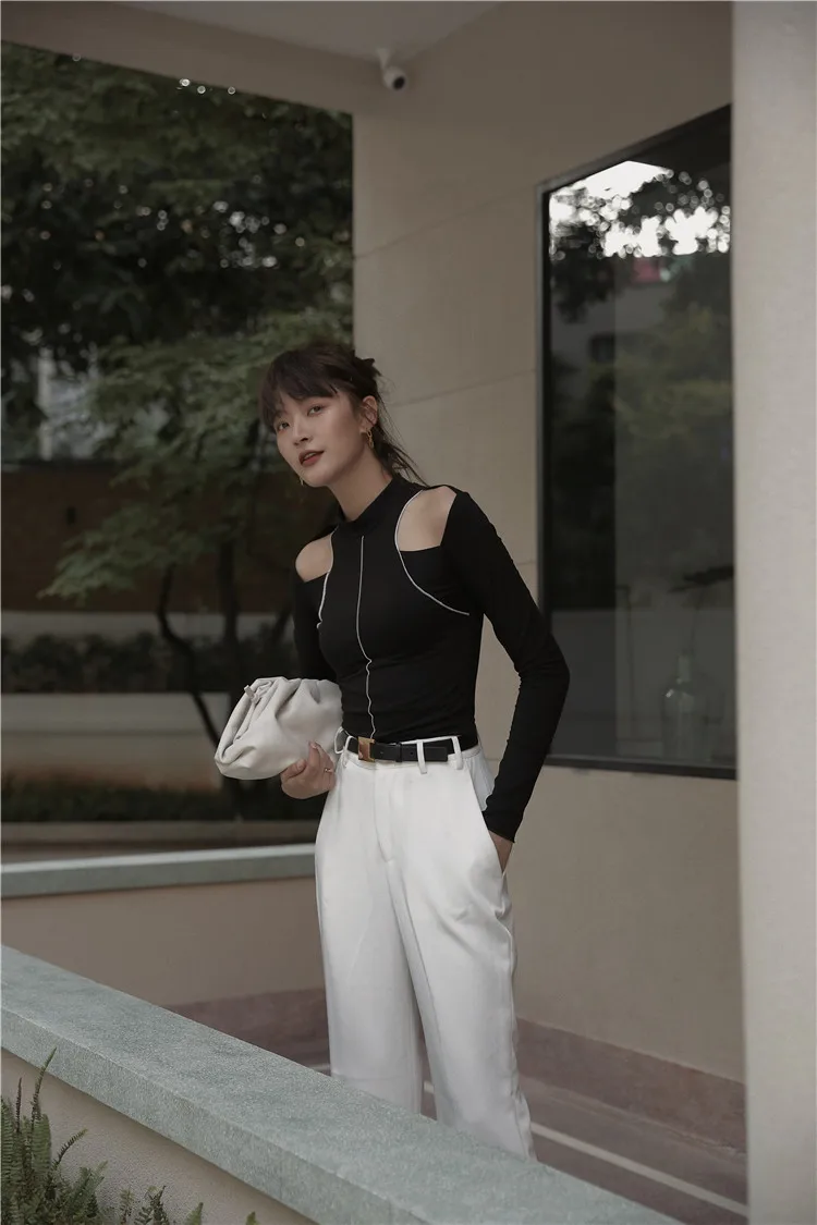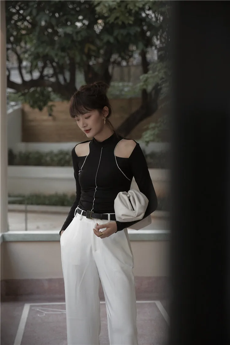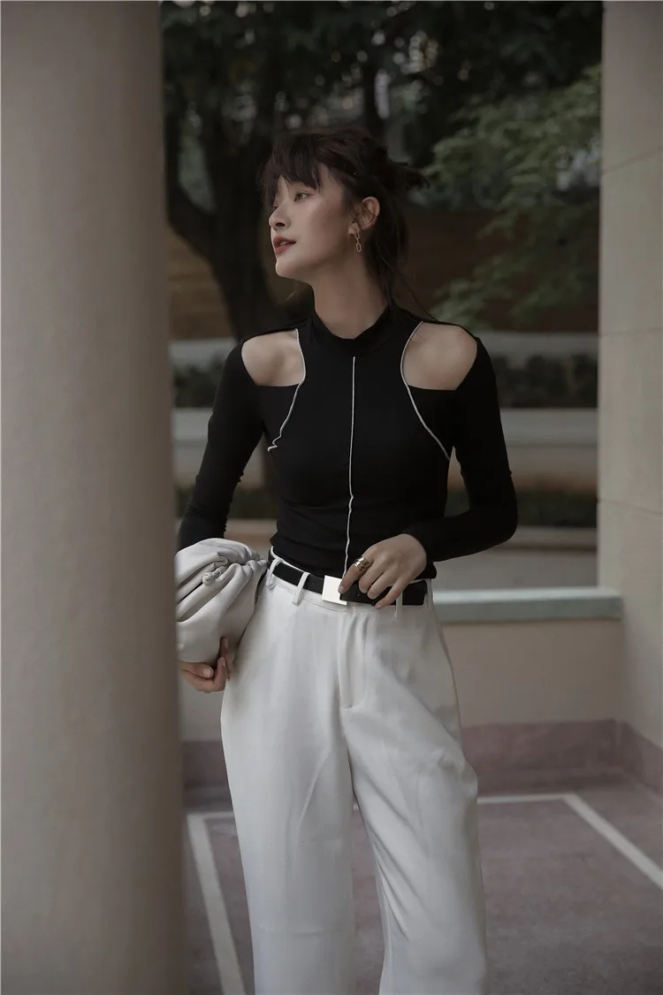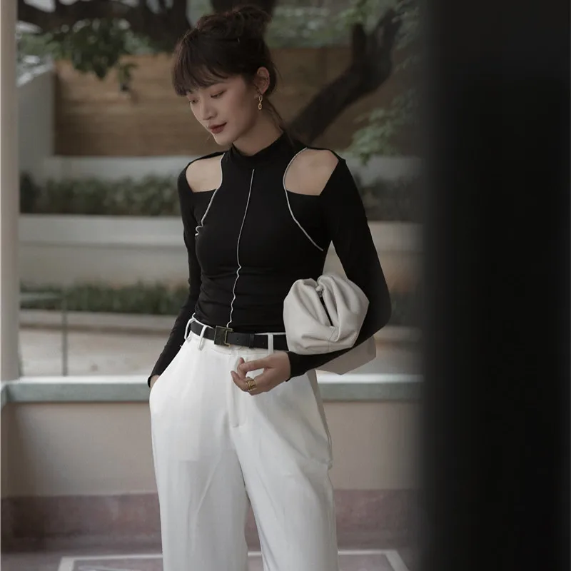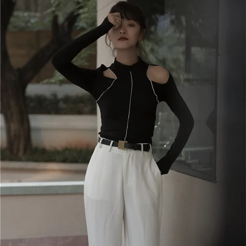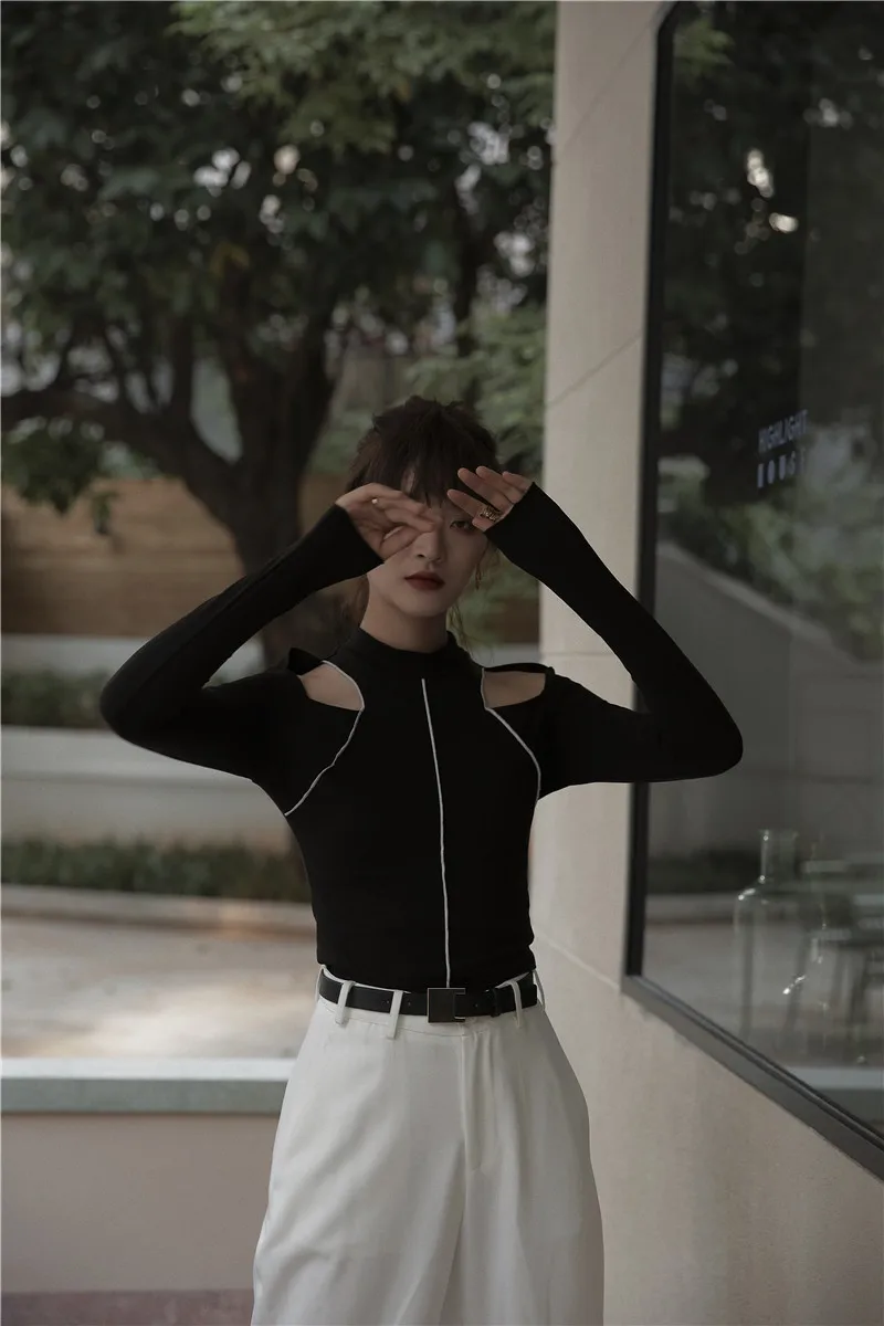 Сексуальный Топ CHEERART с длинным рукавом, черная футболка с открытыми плечами, Женский облегающий дизайнерский Топ, нижнее белье, футболка, осенняя одежда