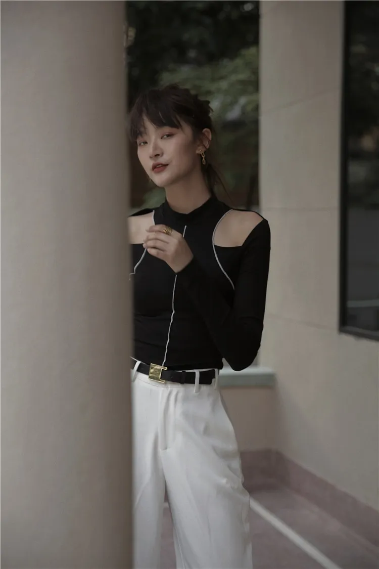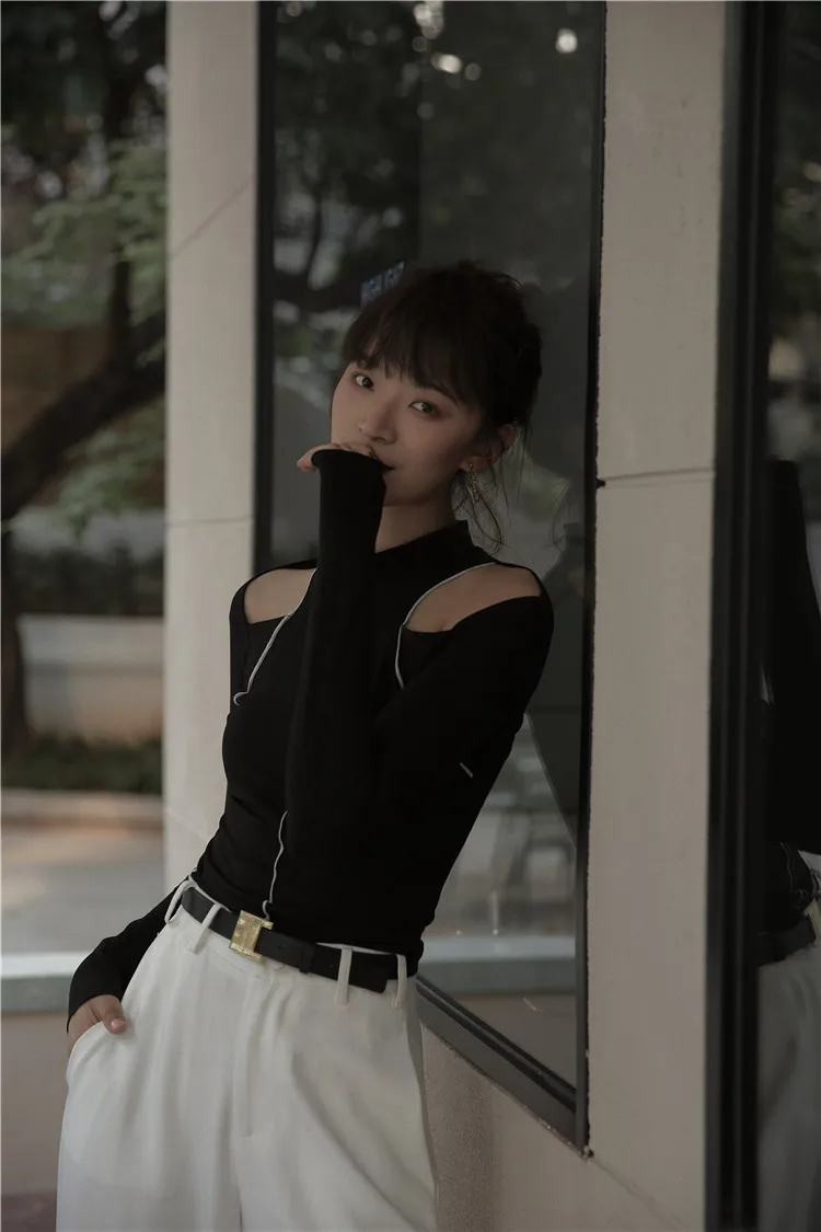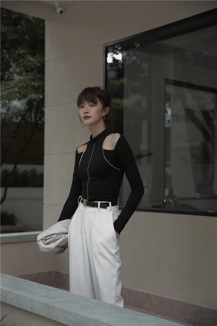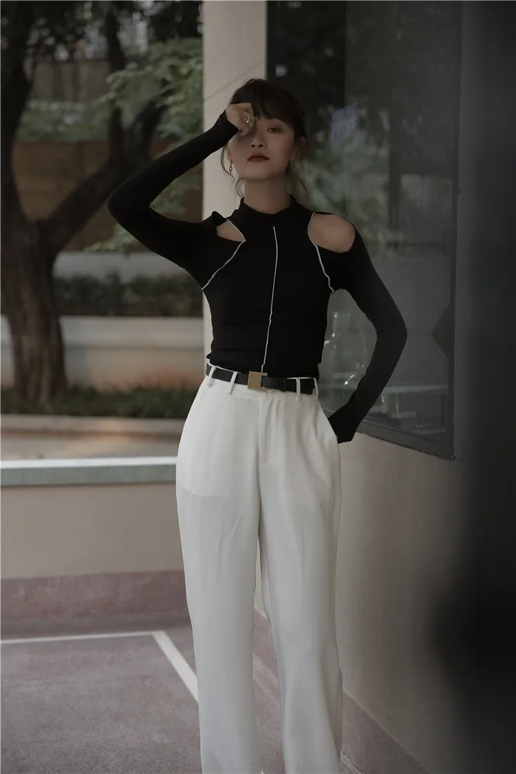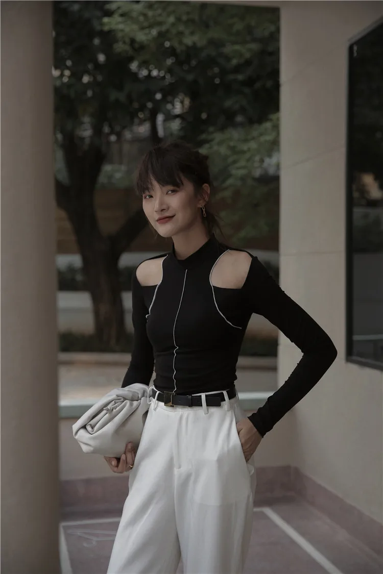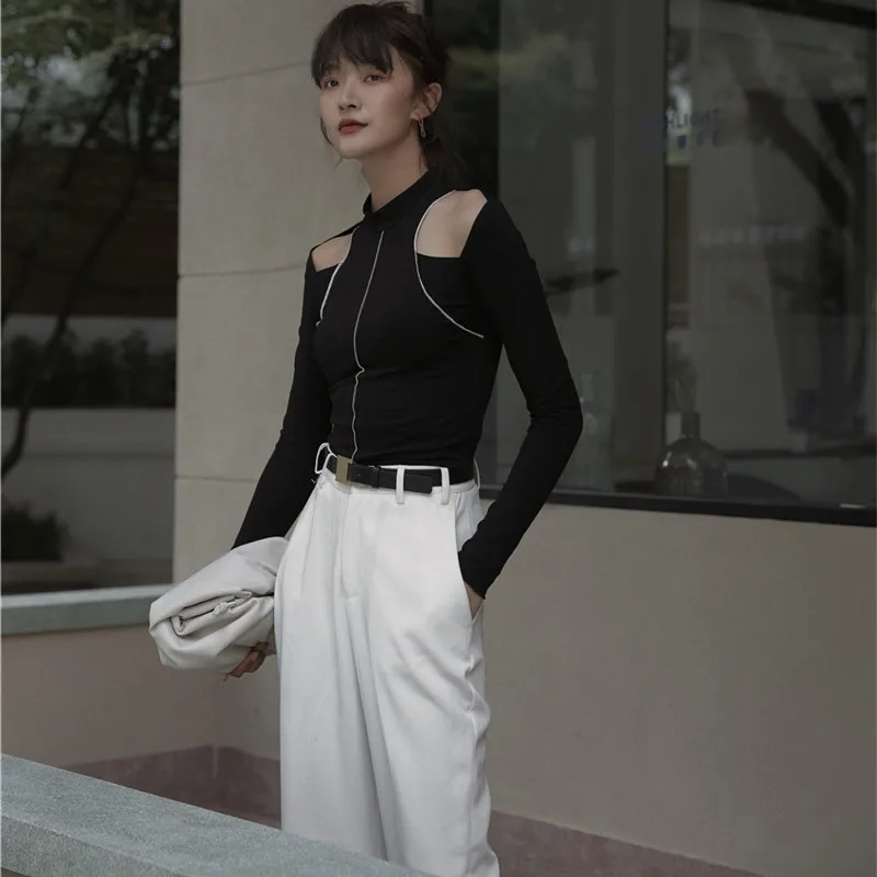 Сексуальный Топ CHEERART с длинным рукавом, черная футболка с открытыми плечами, Женский облегающий дизайнерский Топ, нижнее белье, футболка, осенняя одежда