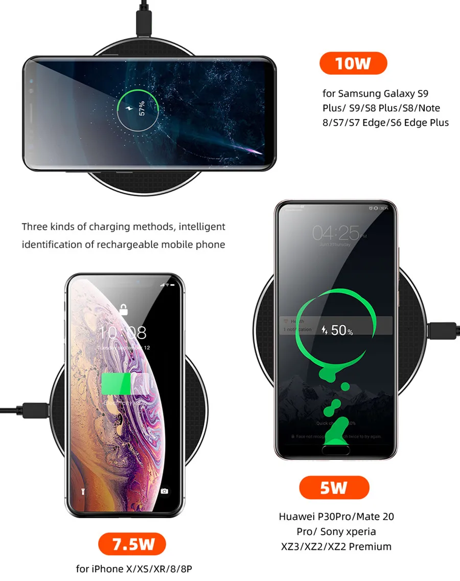 Примите к сведению, чтоСовместим со всеми смартфонами, которые поддерживают Беспроводное зарядное устройство; Прежде чем размещать заказы, пожалуйста, подтвердите, что ваш телефон поддерживает Беспроводное зарядное устройство, если нет, вам нужно купить другой беспроводной приемник для беспроводного зарядного устройства.