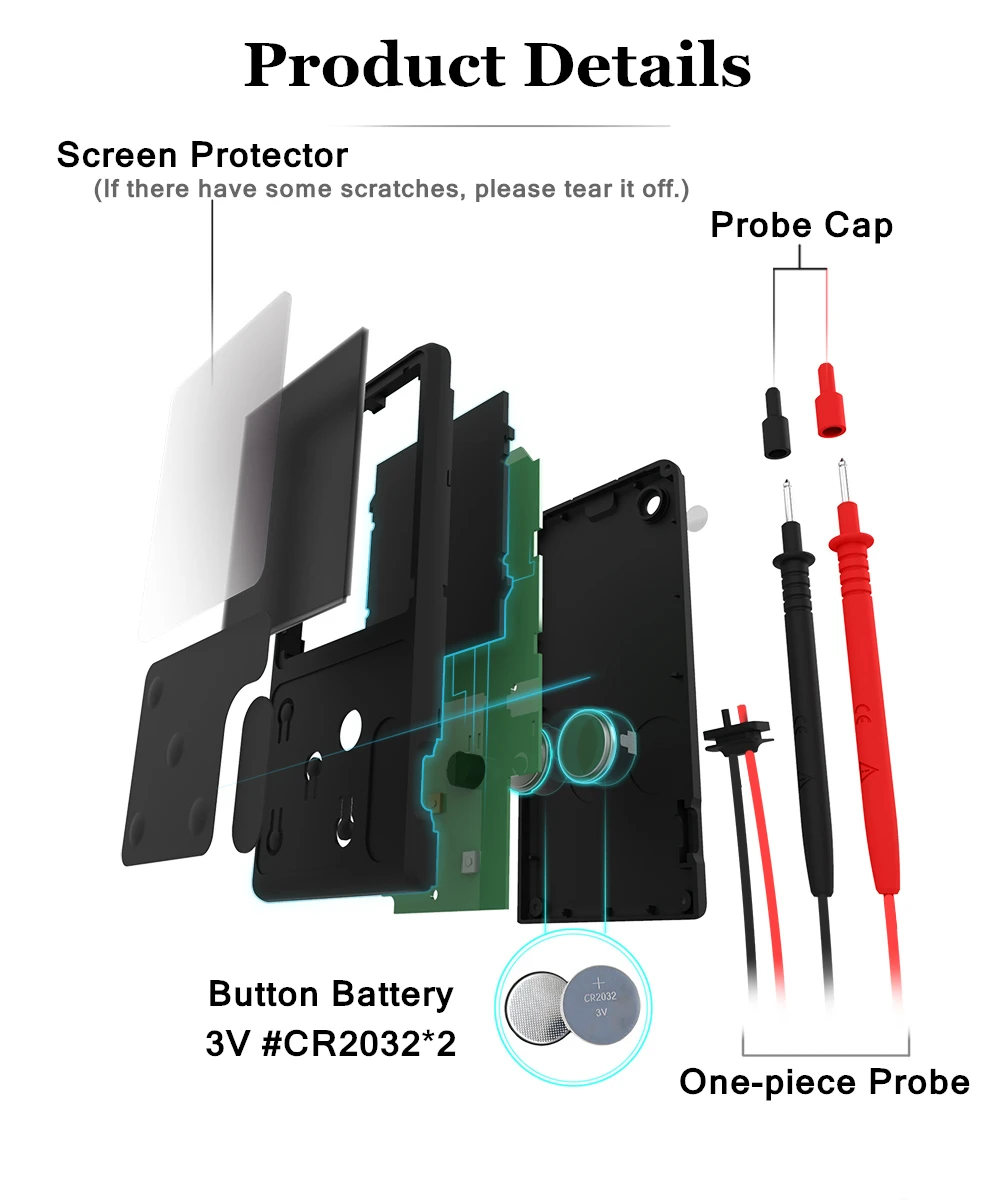 1 х мультиметр. 1 х тестовый свинец. 1 x Веревка для переноски (подарок). 1 волшебная паста (подарок). 1 x Руководство пользователя. Аккумулятор (встроенный)-2 шт. 1 х Упаковочная коробка.