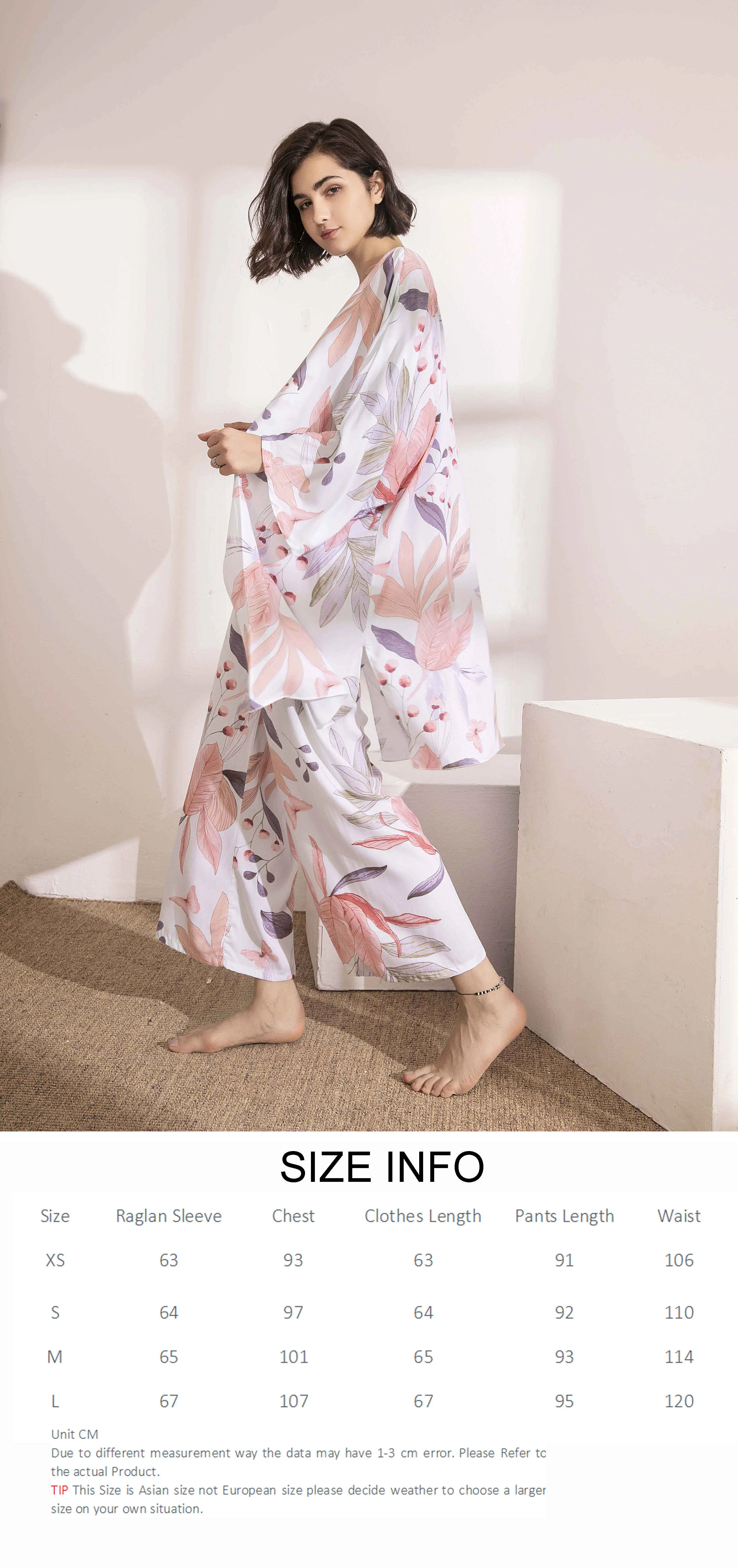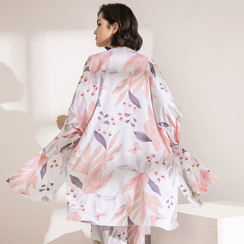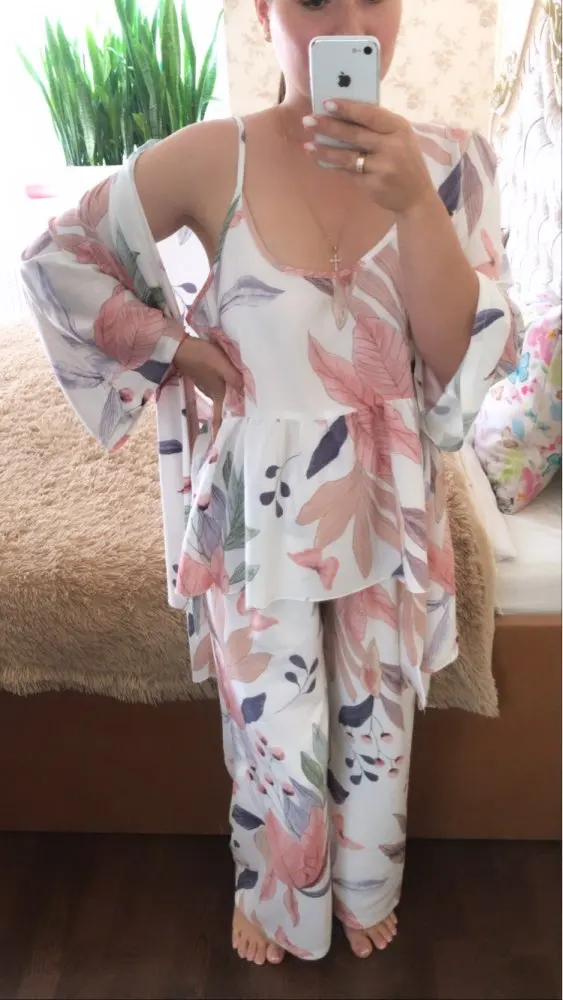 Комплект пижамный Женский, из 3 предметов, с принтом в виде розовых листьев