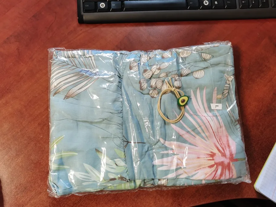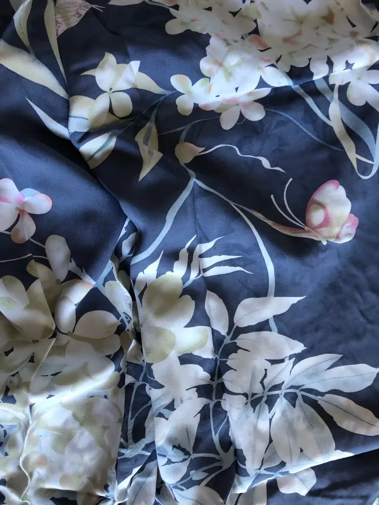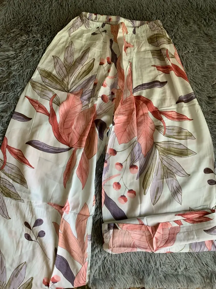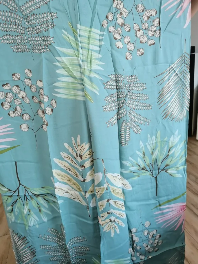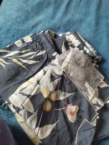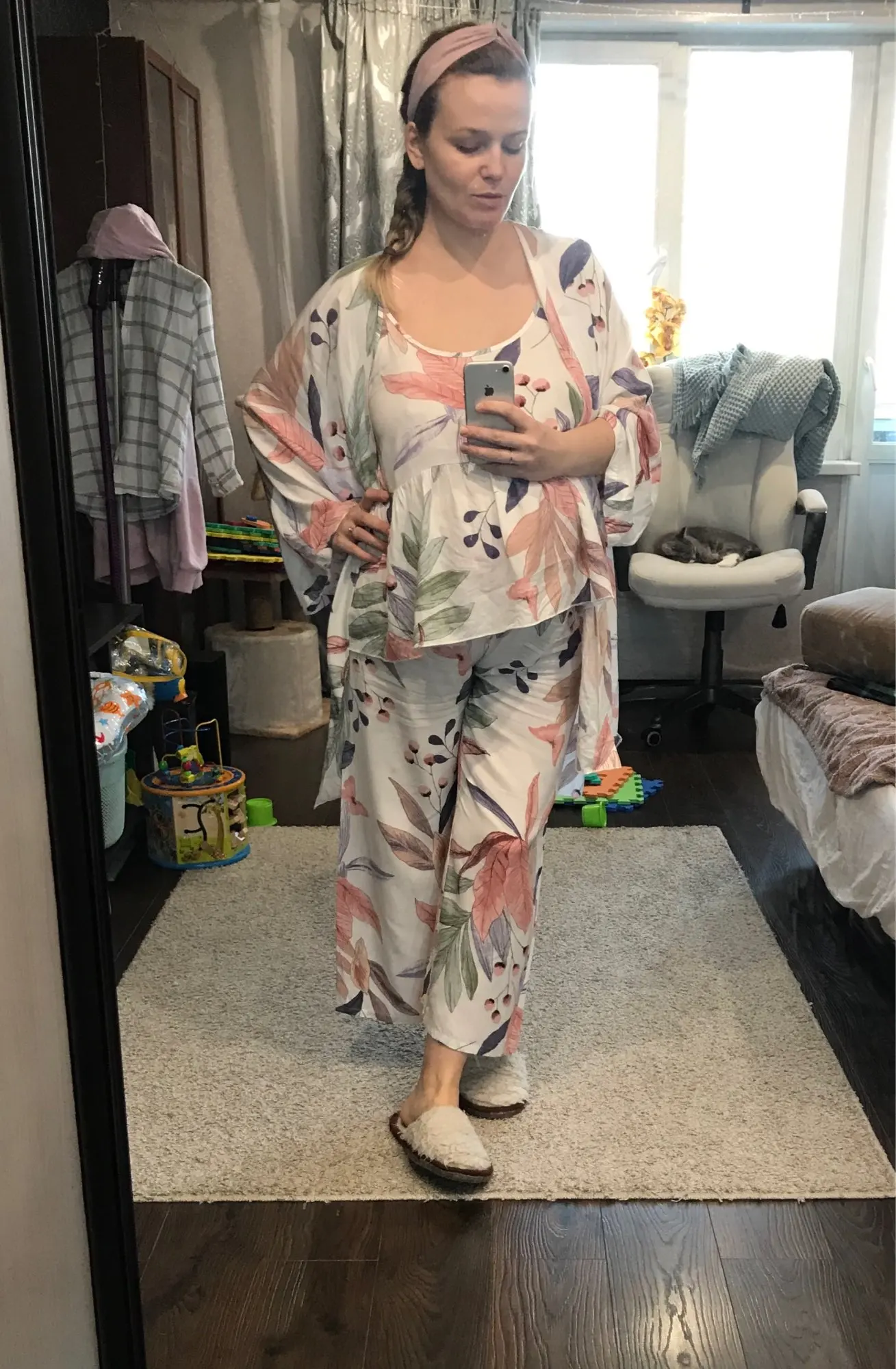 Ткань тонкий хлопок , принт чёткий , не яркий , красивый , как на фото . Брала размер S на рост 167, ОГ 96, ОБ 91 . брюки чуть выше щиколотки , но это ок , верх и халат как раз . Брюки на резинке , даже с беременным животом на 9 месяце я влезла :)) швы аккуратные . Мне нравится !
