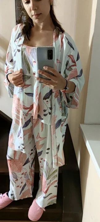 Прекрасный комплект для дома, вискоза, расцветка приятная, на мой рост 180 я сразу понимала, что брючки как кюлоты будут, планирую купить ещё парочку ) благодаря отзывам размер определила, на бёдра 100 L то, что нужно для дома. Для полной идеальности не хватило мне пояса для накидки халата, но не критично