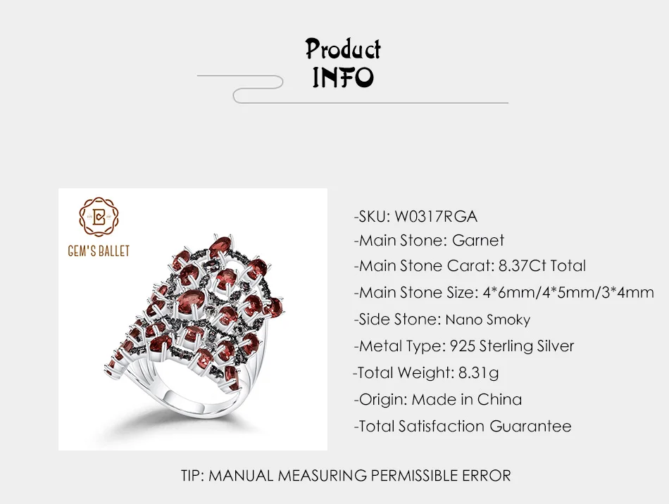 Женское кольцо с красным гранатом GEM'S BALLET 1.87Ct, кольцо из ст...