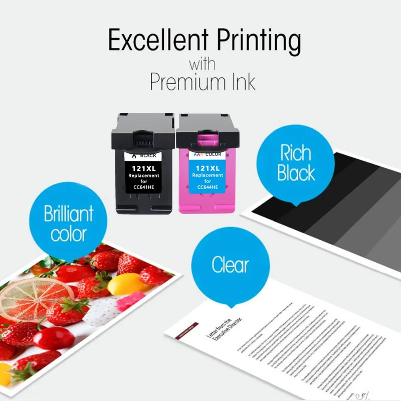 Модель продукта: Восстановленный чернильный картридж для HP 121XLХарактеристика: ВосстановленныйЦвет картриджа: черный и трехцветный (C/M/Y)Объем: Bk-18ml, Tri-color-18mlВыход страницы: Bk 600 страниц, трехцветные 450 страниц (формат А4, 5% покрытия)Совместимый принтер:Для принтера HP Deskjet D2563Для принтера HP Deskjet F4283 все-в-одномДля HP Deskjet F2423 F2483 F2493 F4213 F4275 F4283 F4583 printeЕсли ваш оригинальный чернильный картридж 121 или 121XL, наш картридж подойдет для вашего принтера.