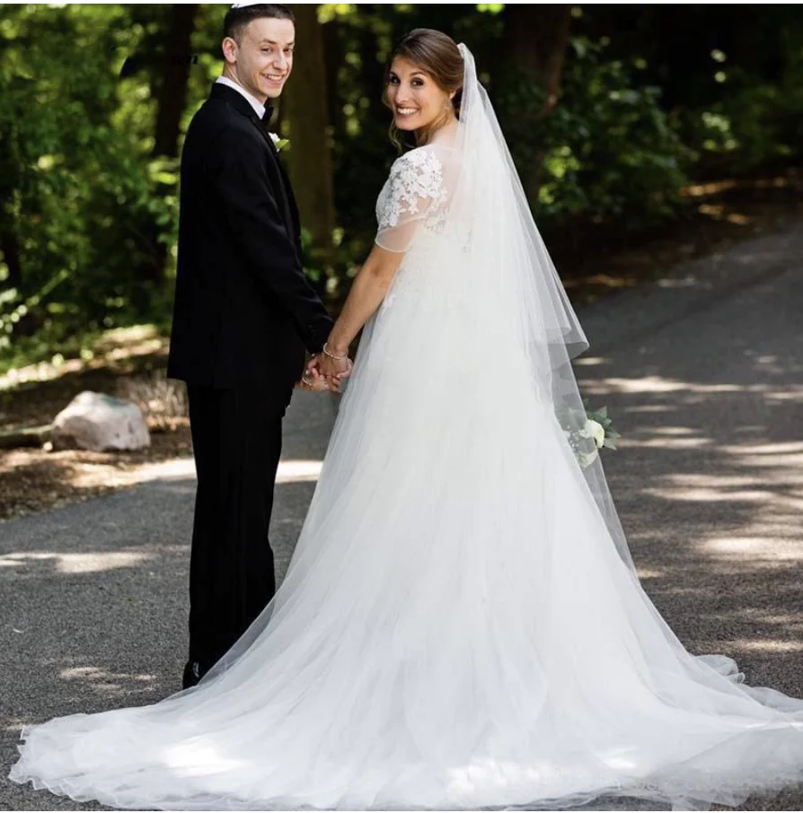 Свадебное платье E JUE SHUNG, скромное, ТРАПЕЦИЕВИДНОЕ, с коротким рукавом, с глубоким круглым вырезом, с аппликацией на спине, в стиле кантри, 2020