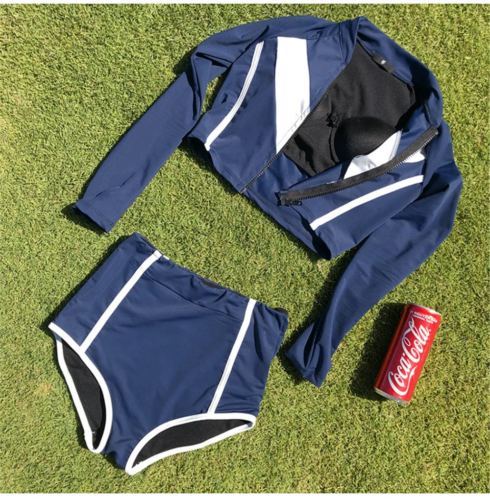 Женский купальник-танкини с длинным рукавом, однотонный купальник из двух частей, с высокой талией, на молнии, шорты, костюм для серфинга, укороченный топ, купальный костюм