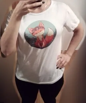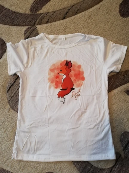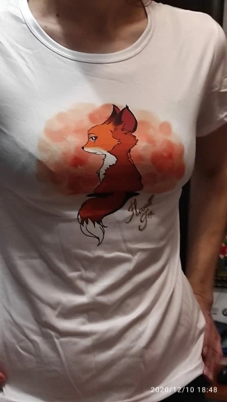 Доставка новой почтой. Футболка из синтетики. На 40 размер подошла отлично. Лиса на принте обиженная) После стирки все хорошо.