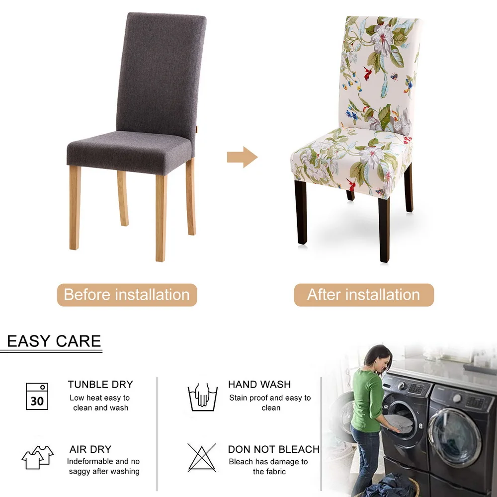 Тип: чехлы для обеденных стульевРазмер: Высота спинки: 45-60 смДлина и ширина сиденья: 40-50 смЦвет: показано на картинкеМатериал: 92% полиэстер 8% спандексУпаковка: 1 шт. х чехлы для стульевОсобенности:Полиэстер спандекс. Мягкий материал, удобный и устойчивый к морщинкам, не требует глажки.Растягивающийся материал, растягивающийся, быстро восстанавливается, надежно прилегает к пришитой эластичной кромке.Машинная стирка, легко моется и моетсяПривлекательный дизайн и красивый патернПусть ваш старый или уродливый стул будет выглядеть как новый и более красивый. Также может предотвратить царапины и укусы вашего стулаОн используется для отеля, свадебного банкета, ужина, встречи, торжества, церемонии, украшения семейной столовой и т. д.