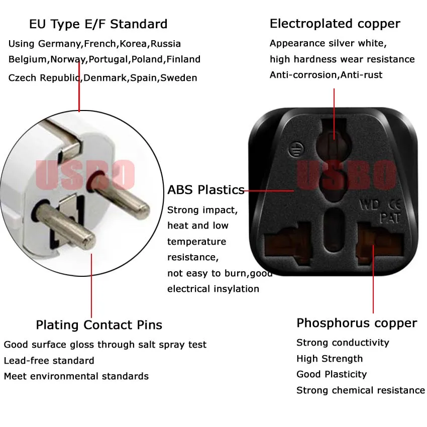 Сила у вас под рукой Используется главным образом в немецкой французской России Корее. Используйте этот Универсальный Переходник типа 3 в 1 для преобразования ваших потребностей в питании. Компактный для легкого путешествия Этот Тип 3 в 1 Универсальный Переходник мал по размеру и светильник по весу, благодаря тому, что вы используете в любом месте по всему миру ваших поездок может занять у вас. Совместим с преобразователями питания и устройствами с универсальными источниками питания Многие устройства обеспечивают диапазон напряжения 110-240 В. Этот тип универсального штепсельного адаптера адаптируется только к стилю штепсельной вилки, а не к напряжению. Адаптер должен использоваться только с преобразователями питания или устройствами с универсальными источниками питания. Ограниченная пожизненная Гарантия USBO обслуживает миллионы клиентов более 10 лет, и каждый продукт поставляется с ограниченной пожизненной гарантией. Если вы не полностью удовлетворены своей покупкой, обратитесь в нашу опытную и специализированную службу поддержки клиентов в Китае для 24 часов в день, 7 дней в неделю. Для получения дополнительной информации см. Веб-сайт USBO. Технические характеристики Тип: Универсальный немецкий французский Корейский Русский штекер типа E/F (принимает Тип A-O) Напряжение: 110-250 В Ампер: 16А макс