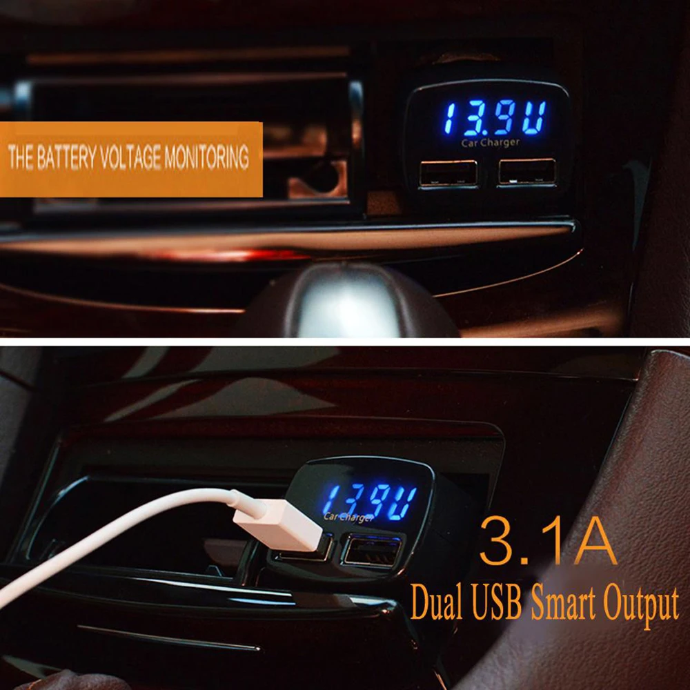 1 шт. Зарядное устройство для автомобиля с двумя USB портами, измерение температуры, вольтметр, амперметр (4 в 1), USB адаптер