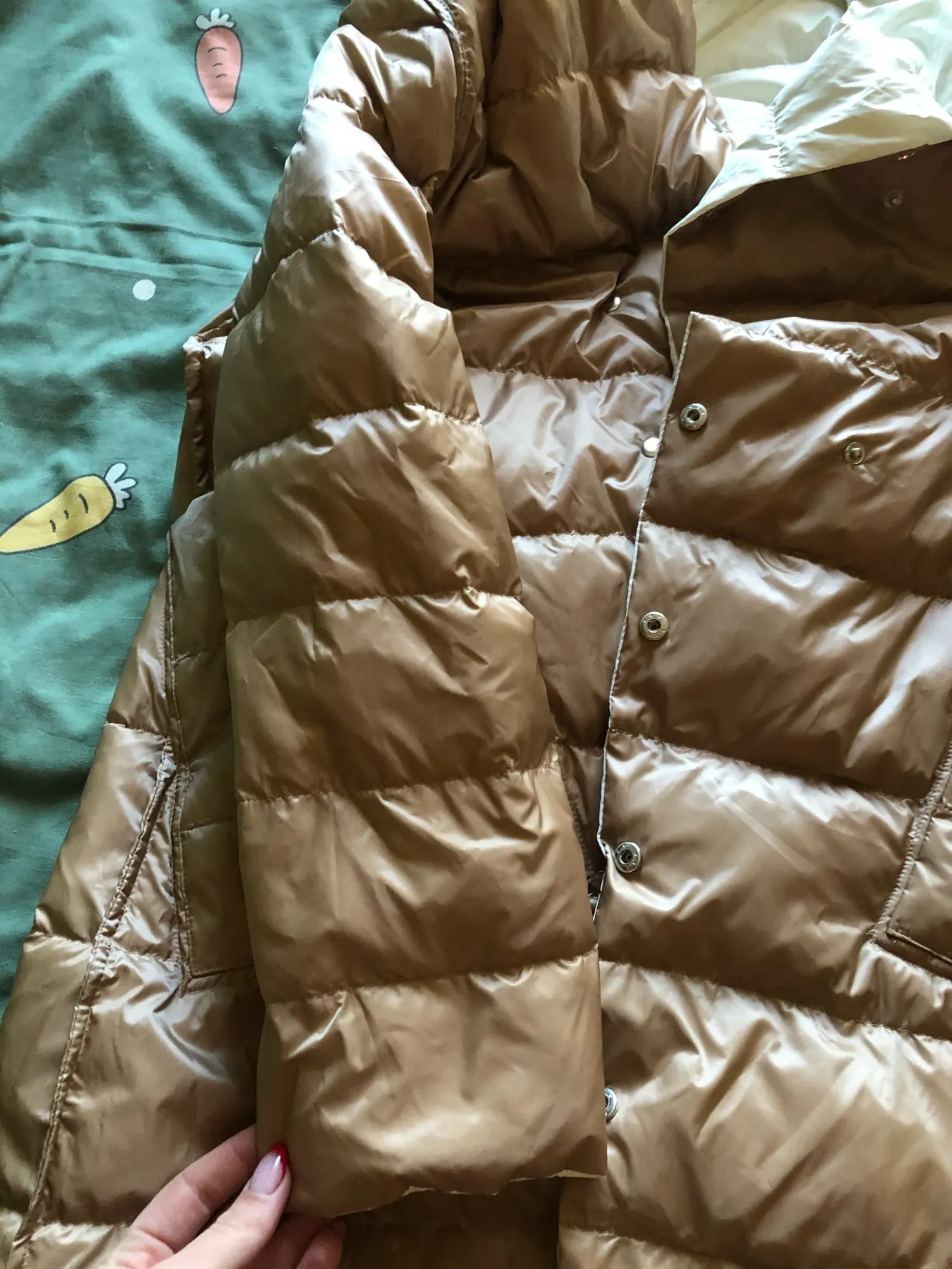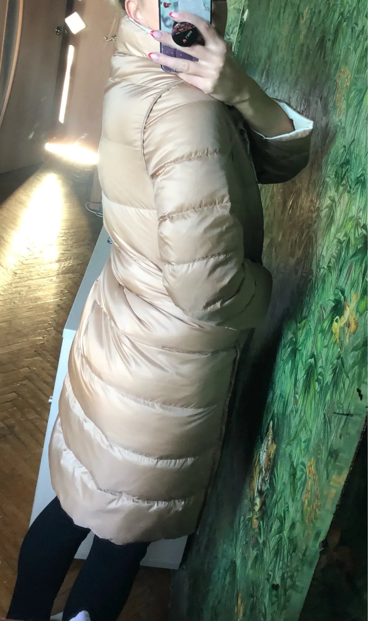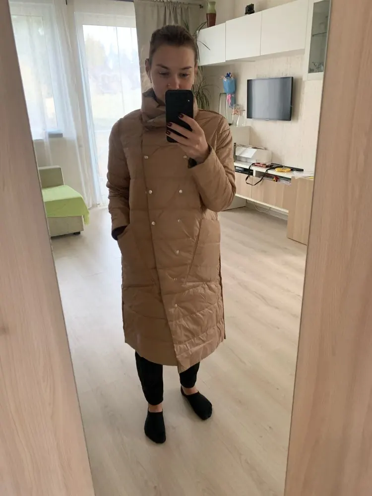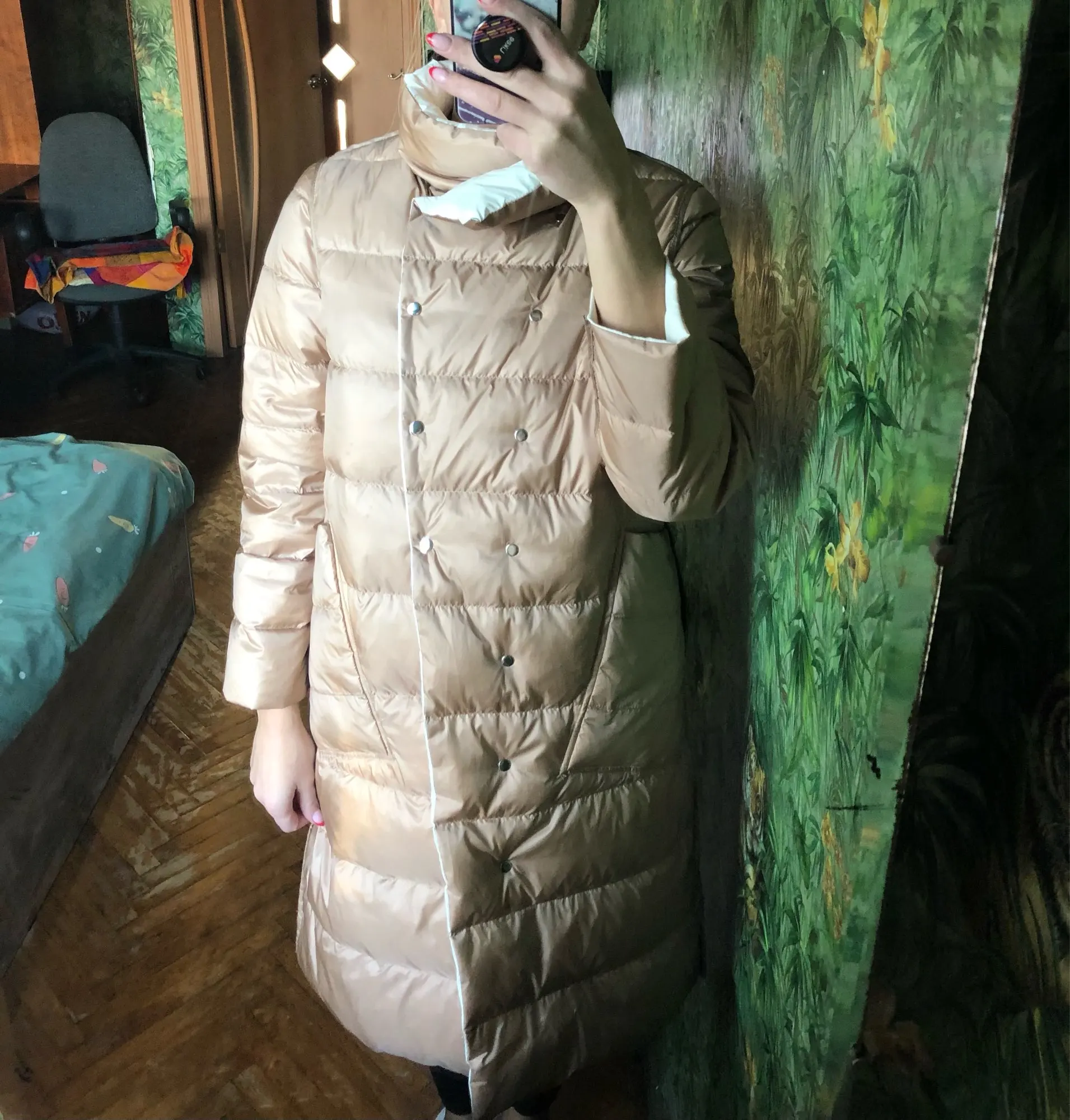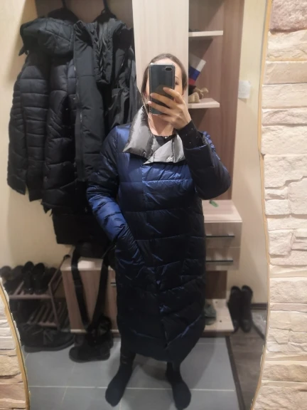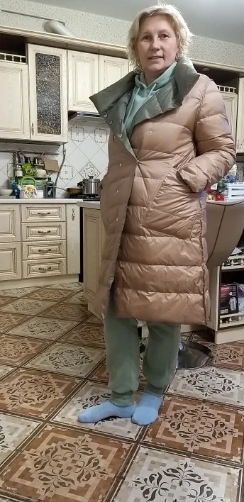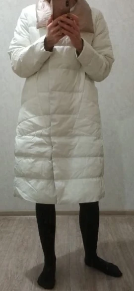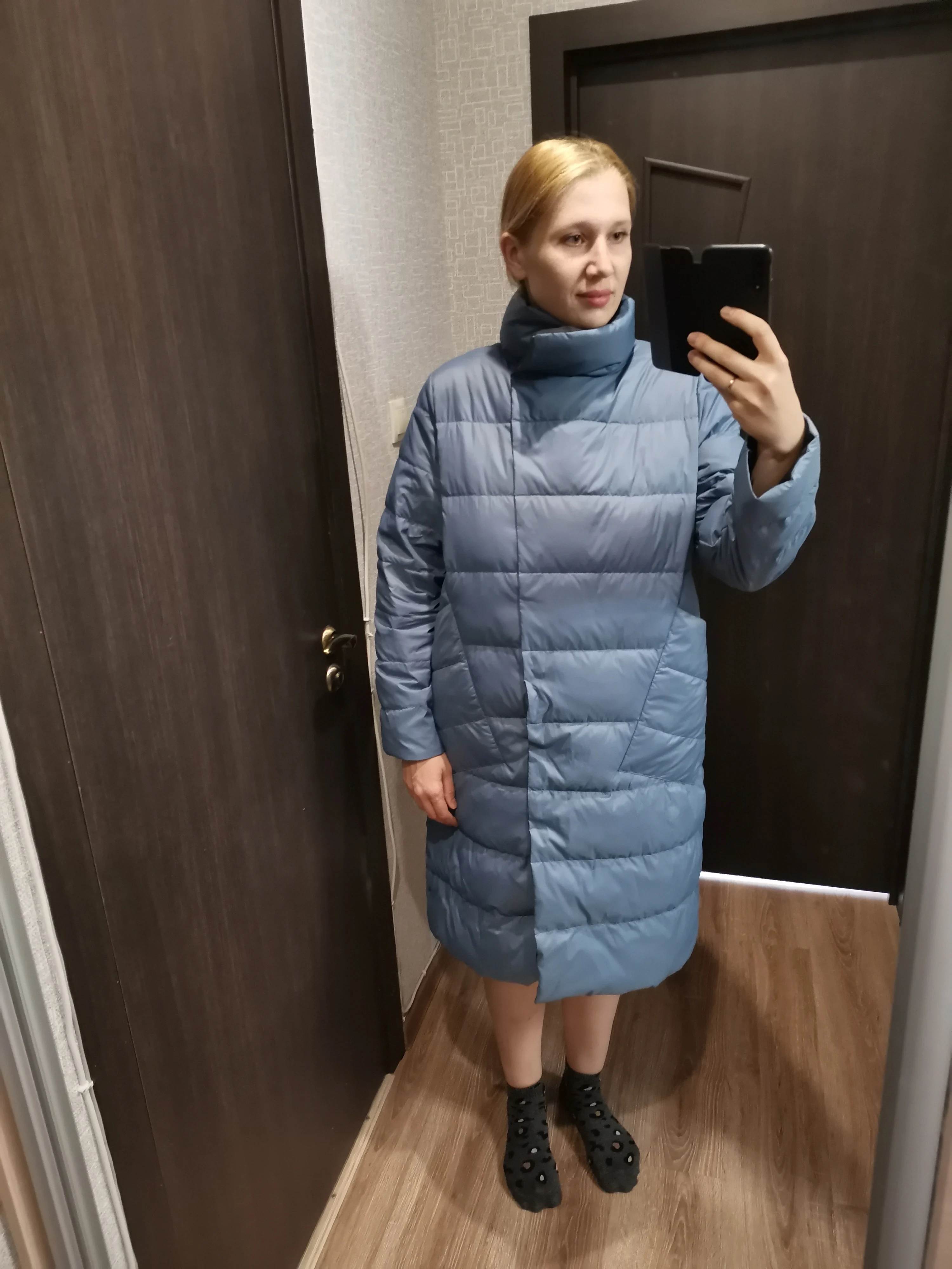 Я безумно довольна покупкой. На размер 46 ( рост 161 см, вес 70 кг, бёдра 106 см) взяла XXL. Размер идеально подошёл, рукава в норме, не маленькие. Есть место надеть со свитером внутри. Я боялась, что будет полнить... но нет, наоборот, очень стройнит. Очень- очень рекомендую. Вещь качественная, лёгкая, действительно внутри пух. Пошив хороший, брака нет.