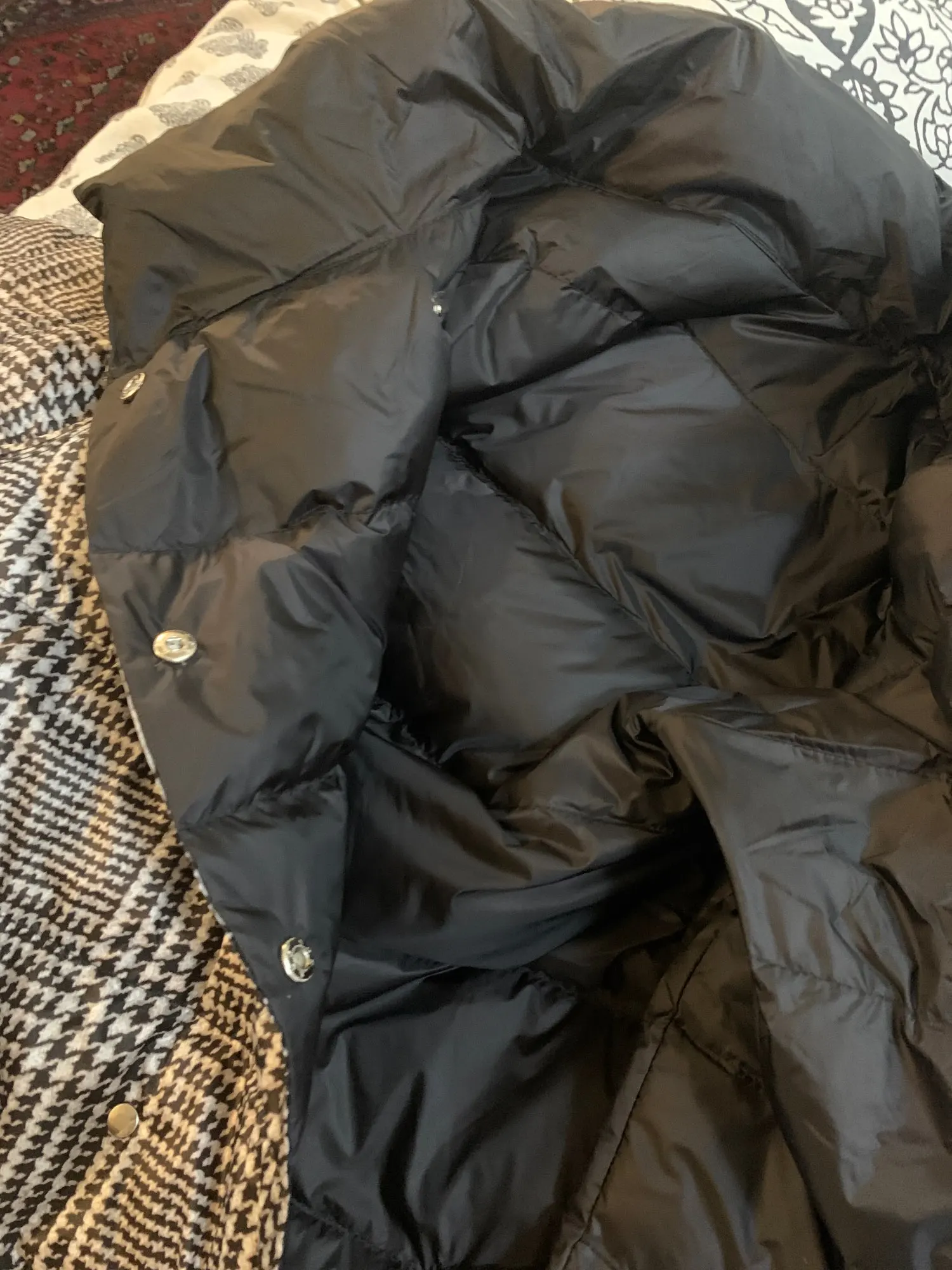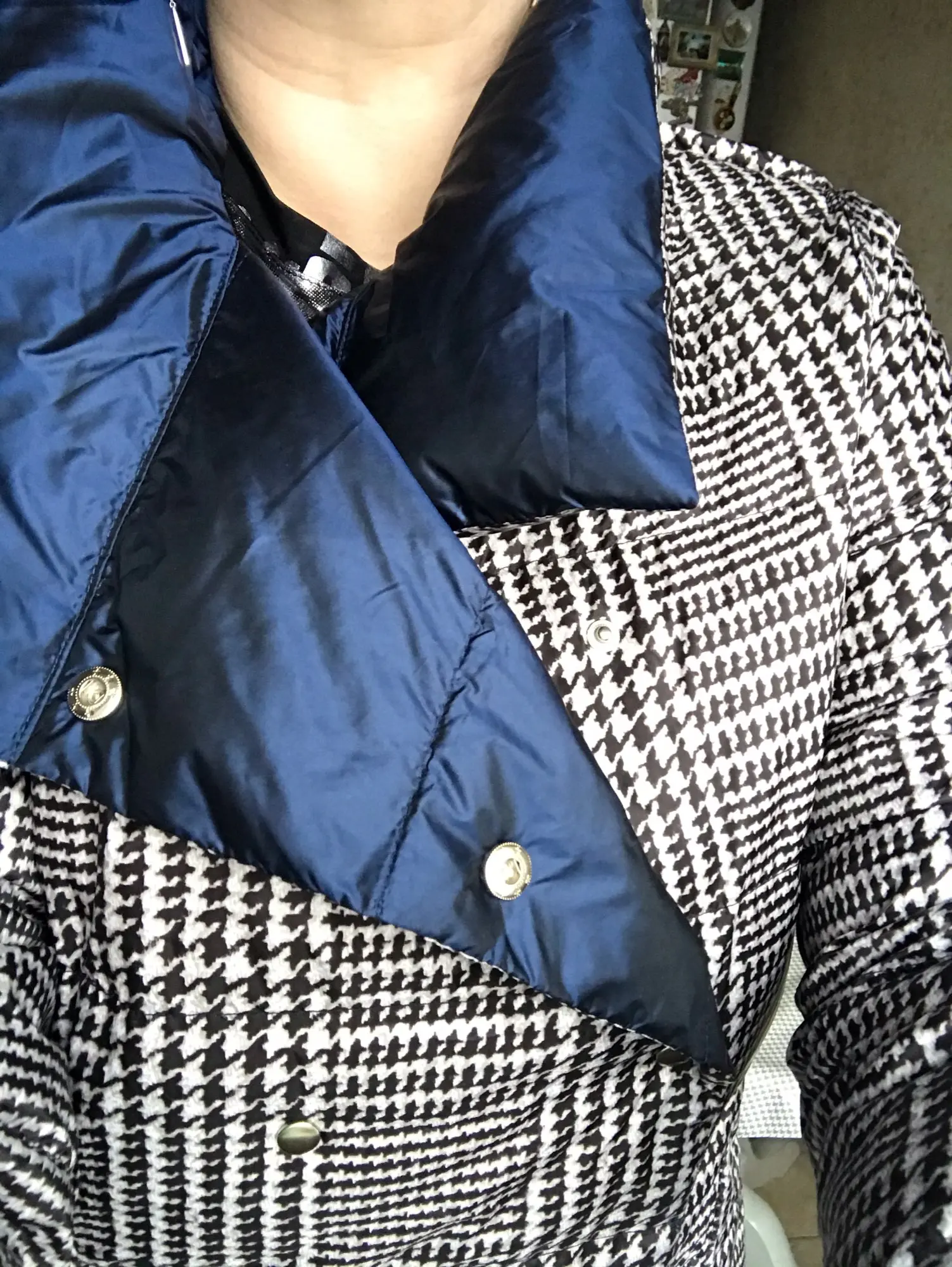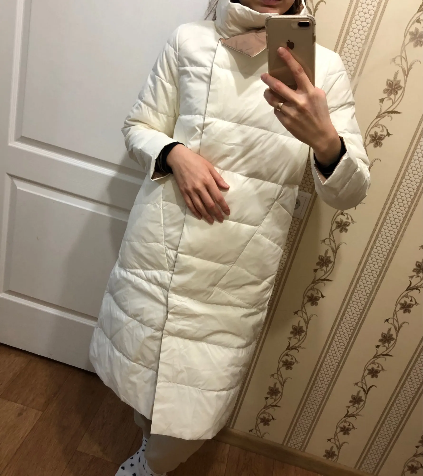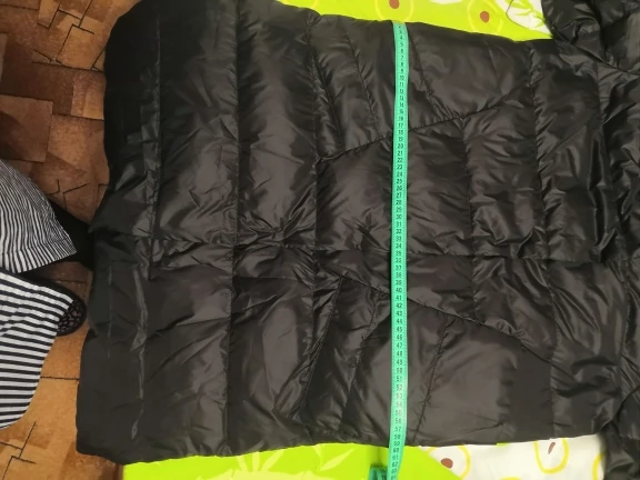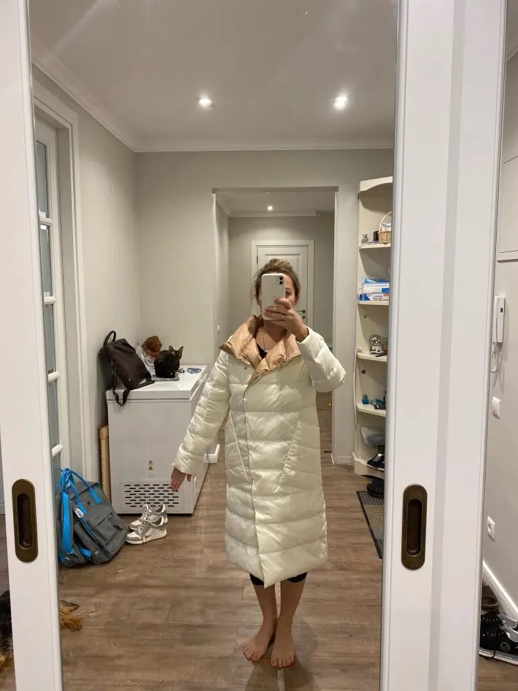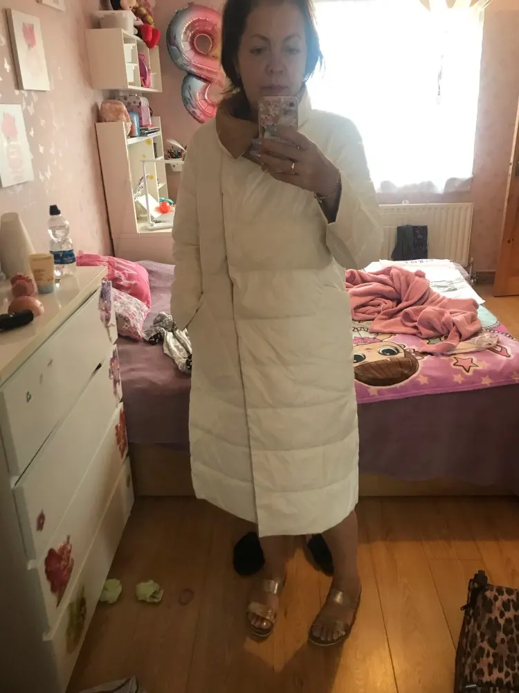 Я безумно довольна покупкой. На размер 46 ( рост 161 см, вес 70 кг, бёдра 106 см) взяла XXL. Размер идеально подошёл, рукава в норме, не маленькие. Есть место надеть со свитером внутри. Я боялась, что будет полнить... но нет, наоборот, очень стройнит. Очень- очень рекомендую. Вещь качественная, лёгкая, действительно внутри пух. Пошив хороший, брака нет.