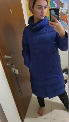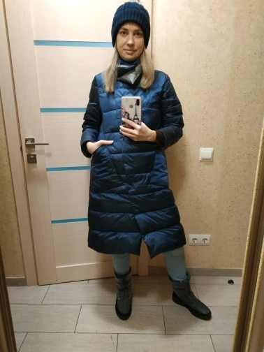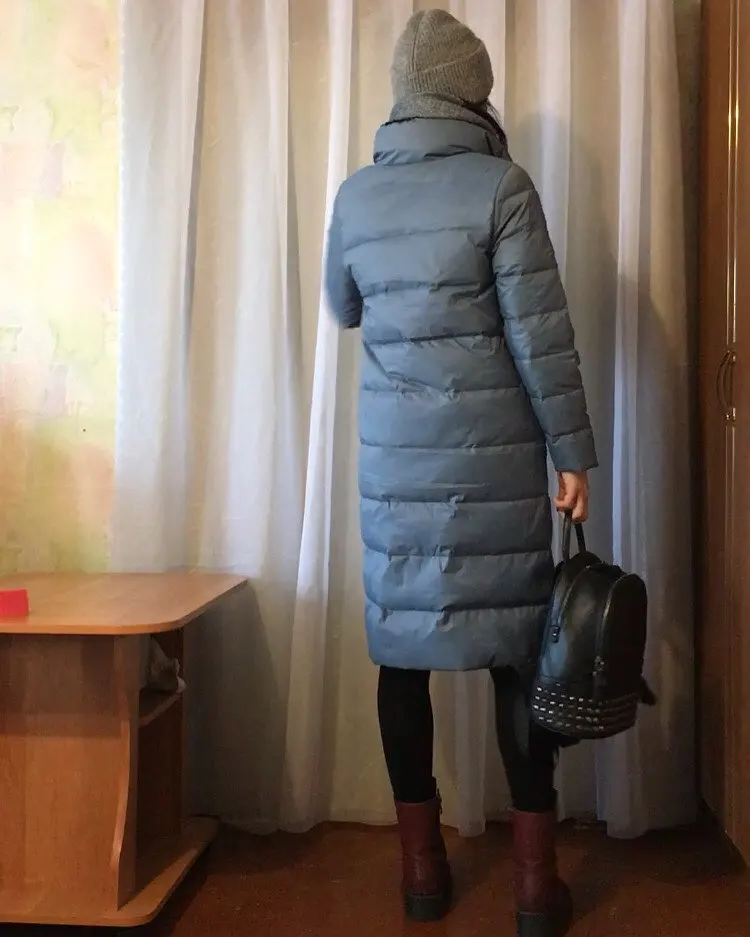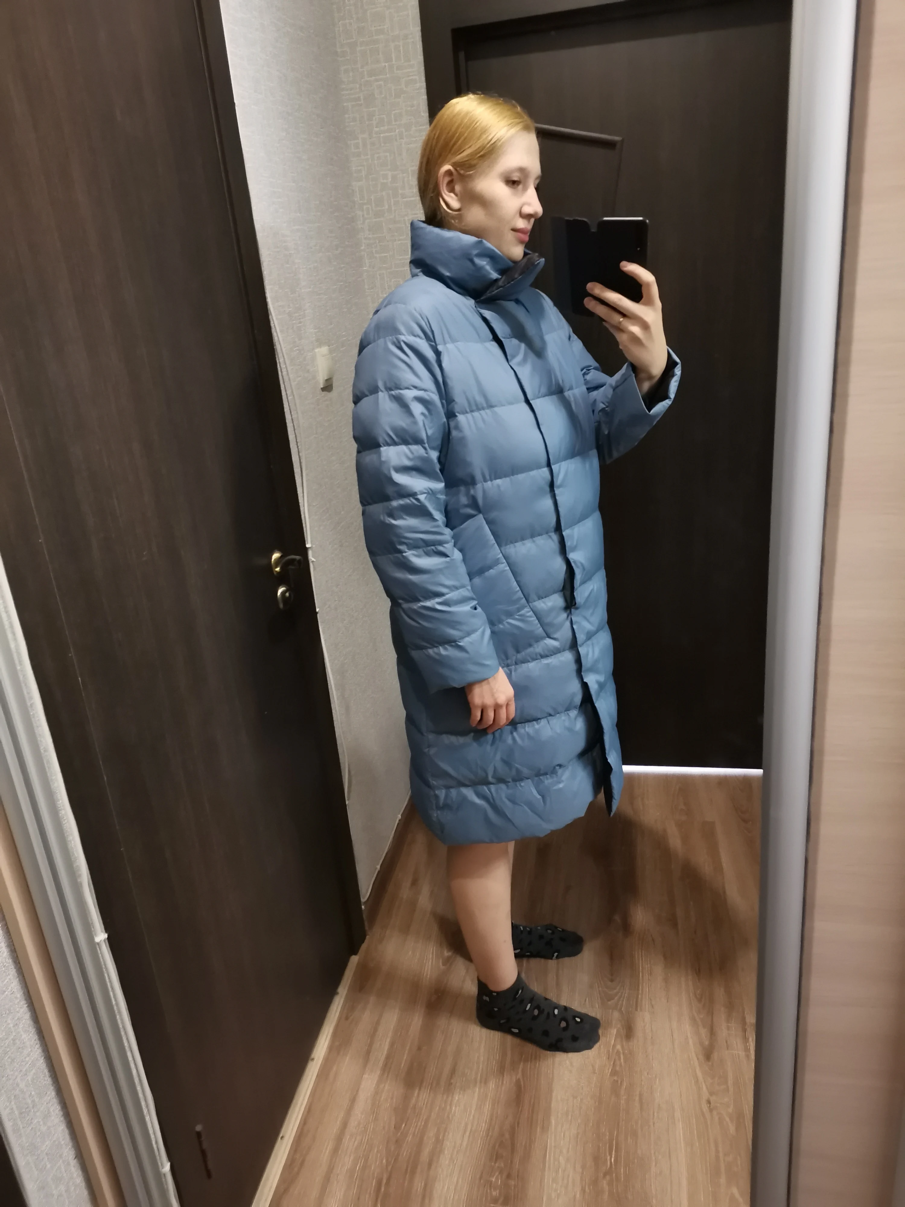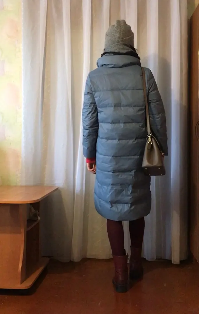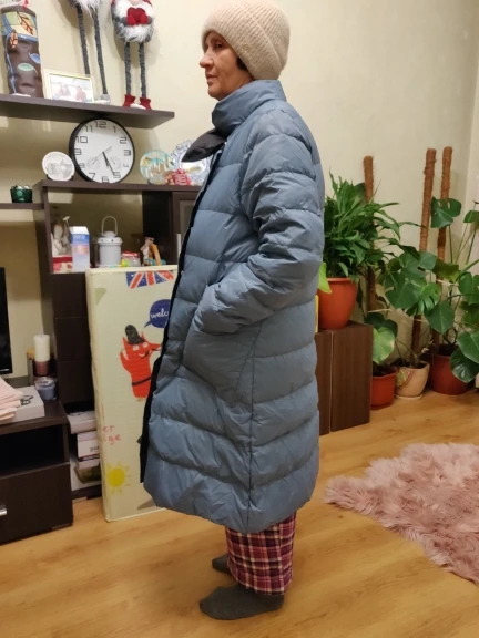 Мои параметры 88-71-91, рост 167 см. Размер XL отлично подошел. Рукав хотелось бы чуть подлиннее, но и так хорошо. Место под кофту есть. Сидит свободно. Люблю такие легкие пуховики на пуху. В минус 12 с ветром надела под него легкую кофту, толстовку теплую, лосины с начесом, юбку. Если по полчаса на остановках не стоять, замерзнуть в этом всем не успеваешь. До минус 7 спокойно в нем можно ходить. Погладила утюгом налицо без марли - все нормально. Ниток торчащих почти нет. Цвет приглушенный, пыльный голубой. Конечно, более плотные пуховики будут теплее, на зато от такого пухана не устаешь. У меня от других теплых объемных пуховиков плечи начинают болеть и неудобно в них. Пришел за месяц после 11.11 в объединенной посылке.